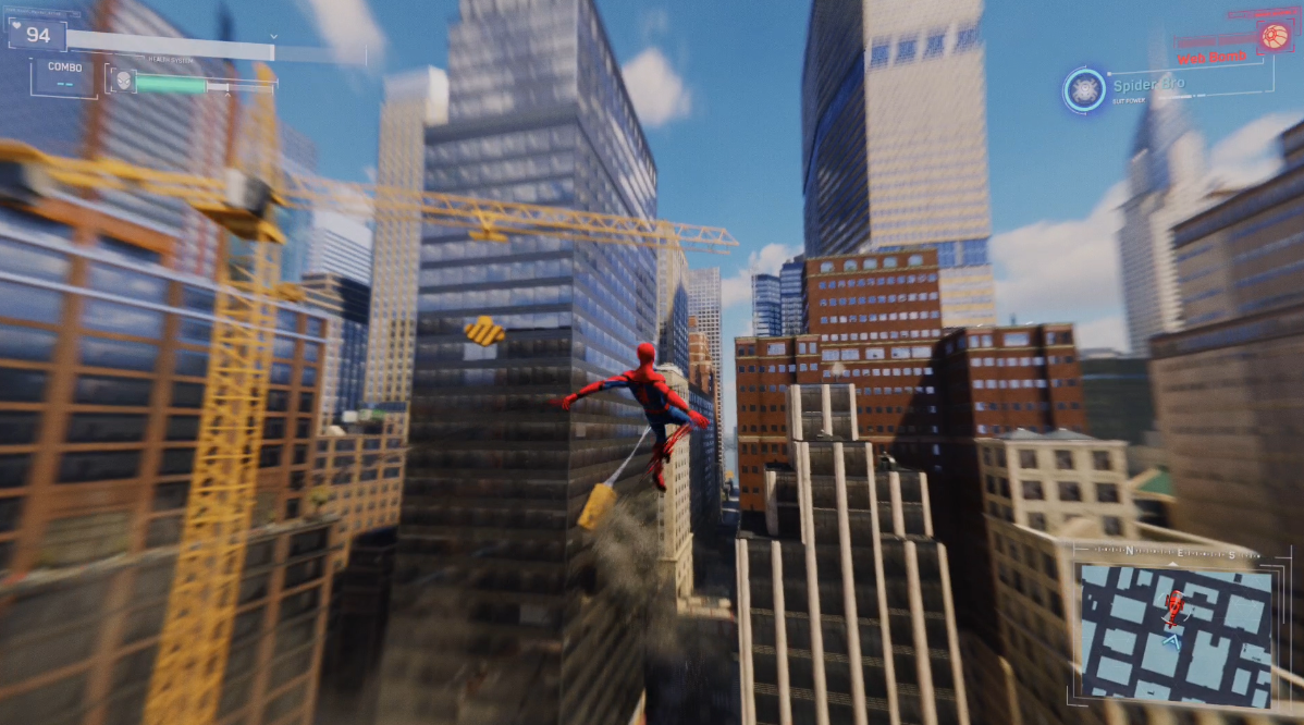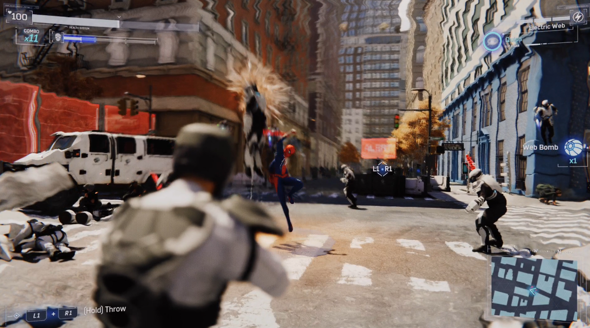 유동적인 애니메이션, 시각 효과 및 컨트롤러 럼블은 강렬함, 속도 및 허공을 날리는 현기증을 판매하는 데 큰 역할을 합니다. 대부분의 경우 서로 다른 이동 기술 간에 매끄럽게 전환되며 보다 정확하고 우아한 횡단 결정을 내리는 데 도움이 되는 감속 메커니즘도 있습니다. L2를 누르고 있으면 기어가는 시간이 느려지고 수동으로 집-투-포인트 기동을 조준할 수 있을 뿐만 아니라 적에게 기습 공격을 시작하거나 다른 작업을 수행할 수 있습니다. -예를 들어, 스윙은 당신에게 놀라운 능력의 느낌을 줄 수 있습니다. 복잡한 작업이기 때문에 여기저기 돌아다니는 것은 스파이더맨의 가장 큰 기쁨입니다. 단순함에도 불구하고 연결되는 모든 동작은 작은 승리처럼 느껴지며,