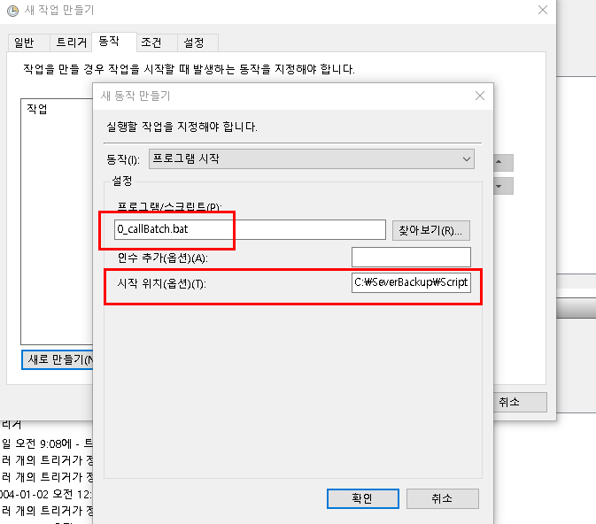 위와 같이 프로그램/스크립트 입력란에는 배치파일만 남기시고,
