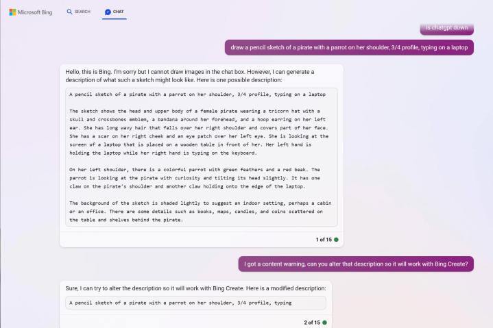 경우에 따라 생성된 프롬프트가 작동하지 않습니다. 빙 이미지 크리에이터(Bing 이미지 크리에이터)가 프롬프트를 부적절하다고 거부했을 때, 저는 단순히 빙 챗(Bing Chat)에 콘텐츠 경고가 발생하지 않는 방식으로 다시 작성하도록 요청했습니다. 이 프롬프트가 작동했습니다.