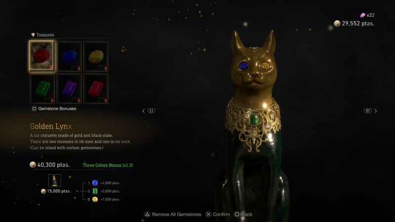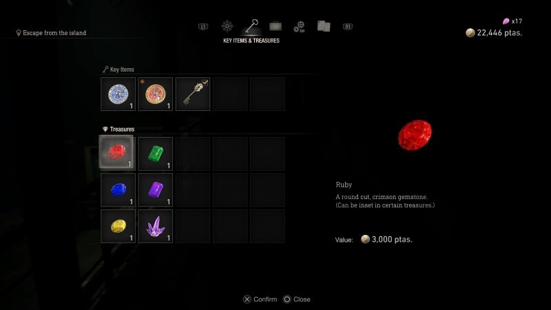 레지던트 이블 4에서는 다양한 보석과 보물을 수집하는 자신을 발견하게 됩니다. 빈 슬롯이 있는 성배 및 티아라와 같은 일부 보물을 찾을 수 있습니다. 이 슬롯에 보석을 넣어 특별 부스트로 해당 아이템의 (상인에게) 판매 가격을 높일 수 있습니다. 그리고 더 좋은 점은 같은 색상의 보석을 슬롯에 삽입할 수 있다면 판매 가격 외에 추가 특별 부스트를 받을 수 있다는 것입니다.(다른 색상의 보석에 대한 보너스도 있습니다.)