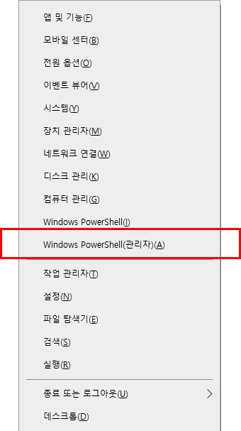1. 윈도키+X > 명령 프롬프트(관리자)(A) 선택 (또는 Windows PowerShell) 선택