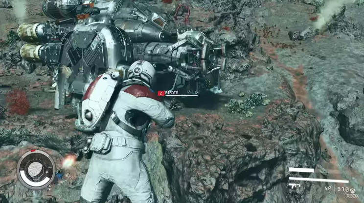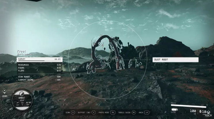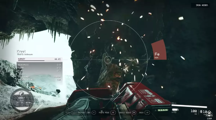 스타필드 게임 플레이는 또한 우리가 행성 측에 있을 때 사용할 수 있는 몇 가지 기능을 보여주었습니다. 우리가 만나는 각 세계를 탐험하고 조사할 때 스캐너 장치를 사용하여 환경에 고유한 자원과 동식물을 찾고 식별할 수 있을 것 같습니다. 스캐너는 해적선과 같은 주변 요소를 스캔하는 데에도 사용할 수 있습니다. UI는 또한 찾을 수 있는 검색 가능한 리소스의 수와 스캔한 동식물의 비율을 보여줍니다. 이것은 행성 주변의 자원을 스캔하고 식별할 수 있는 No Man's Sky에서 스캐너가 작동하는 방식과 매우 유사해 보입니다. 우리는 또한 재료를 채굴하고 수집하는 절단기로 알려진 도구를 보게 됩니다. 이 도구는 레이저 스타일의 드릴을 사용하여 바위가 많은 지형에서 철을 조각합니다.