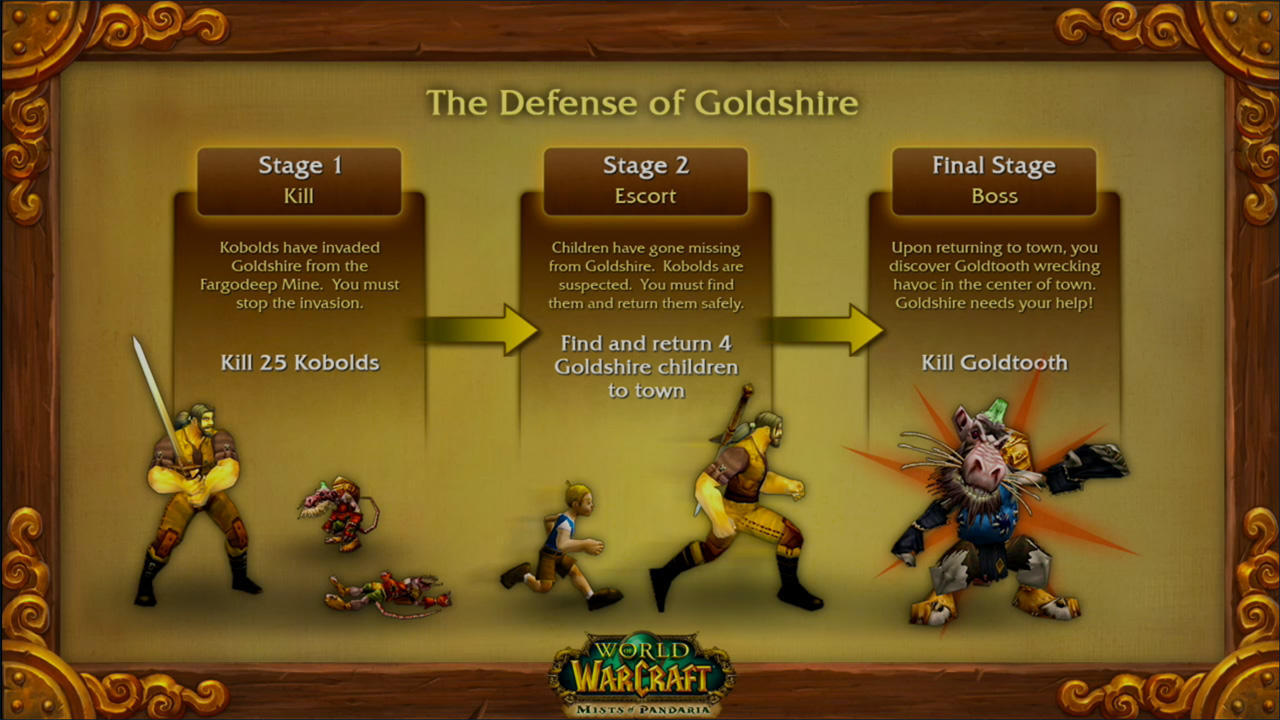 시나리오는 판다리아의 호드 및 얼라이언스 스토리라인을 묘사하는 점진적인 스토리 아크 및 목표가 포함된 짧은 인스턴스입니다. 이전 확장팩에서 본 사례와 달리 시나리오는 완전히 역할이 없으며 달성하기 위해 전용 탱크나 치료사가 필요하지 않습니다.