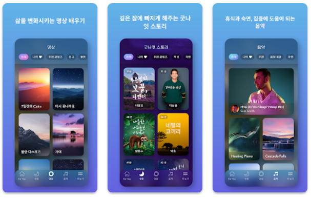 수면 향상, 스트레스 감소, 집중력 향상 등을 위한 명상 및 수면 사운드를 제공하는 앱입니다. : Calm은 수많은 명상 세션과 수면 사운드를 제공하여 사용자가 스트레스를 관리하고 마음을 안정시킬 수 있도록 돕습니다. 또한, 숙면을 위한 수면 스토리나 집중력을 향상시키는 음악 등을 제공합니다.