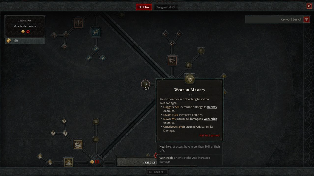 디아블로 4 도적 Weapon Mastery 특성은 사용 중인 무기에 따라 보너스를 부여합니다.