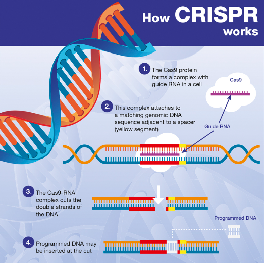 유전자 편집 기술은 생물의 유전자를 원하는 대로 수정하거나 교체할 수 있는 기술입니다. 유전자 편집 기술의 한 종류로 CRISPR* 이라는 것이 있습니다. CRISPR은 균류나 바이러스와 같은 단순한 생물체에서 발견된 자연스러운 방어 메커니즘을 인공적으로 이용한 것입니다. CRISPR은 특정한 DNA 서열을 인식하고 잘라내거나 바꿀 수 있는 가위 역할을 하는 Cas9 단백질과 그 가위를 원하는 위치로 안내하는 RNA로 구성됩니다. CRISPR은 유전자 편집 기술 중에서도 비교적 간단하고 정확하며 저렴한 방법으로 인식되어 많은 연구자들이 관심을 가지고 있습니다.