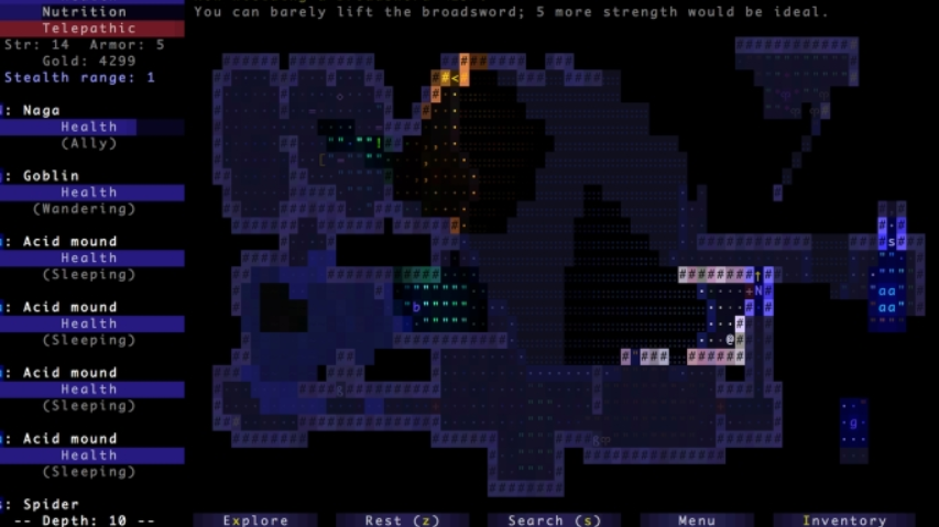 브로그(Brogue) 는 현대 로그라이크(Spelunky 및 Dredmor의 Dungeons 등)와 Nethack, Zangband 및 Rogue와 같은 장르의 ASCII로 그린 선구자 사이의 디딤돌입니다. 이를 수행하는 것은 마우스 컨트롤입니다. 어떤 키보드 버튼이 물약을 마실지 고민하는 대신, 클릭하여 이동하고, 클릭하여 공격하고, 클릭하여 저주받은 반지를 착용하고, 캐릭터 위로 마우스를 가져가면 설명을 읽을 수 있습니다.
