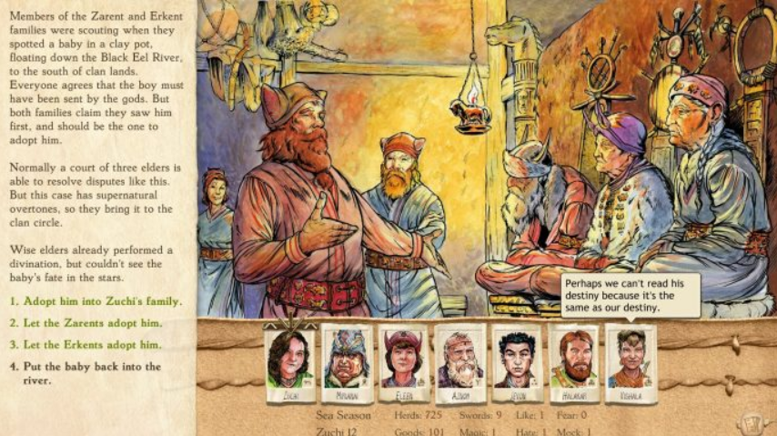 그 사람들은 그들만의 문화를 가지고 있고, 일부 이웃 씨족과 공유하며, 당신의 다양한 역사와 신념으로 인해 다른 지역 문화와 충돌합니다. 무적이 될 때까지 숫자를 효율적으로 사용하기 위해 파벌로 그들을 이끌어야 하는 것이 아니라 결정을 통해 존경과 신뢰, 때로는 두려움을 얻음으로써 그들을 이끌어야 합니다. 사람들은 자신의 문제와 도전을 가지고 당신에게 오고, 당신의 고문은 그들의 능력(및 성격)을 최대한 발휘하여 정보를 제공하고 의견을 제시할 것입니다.