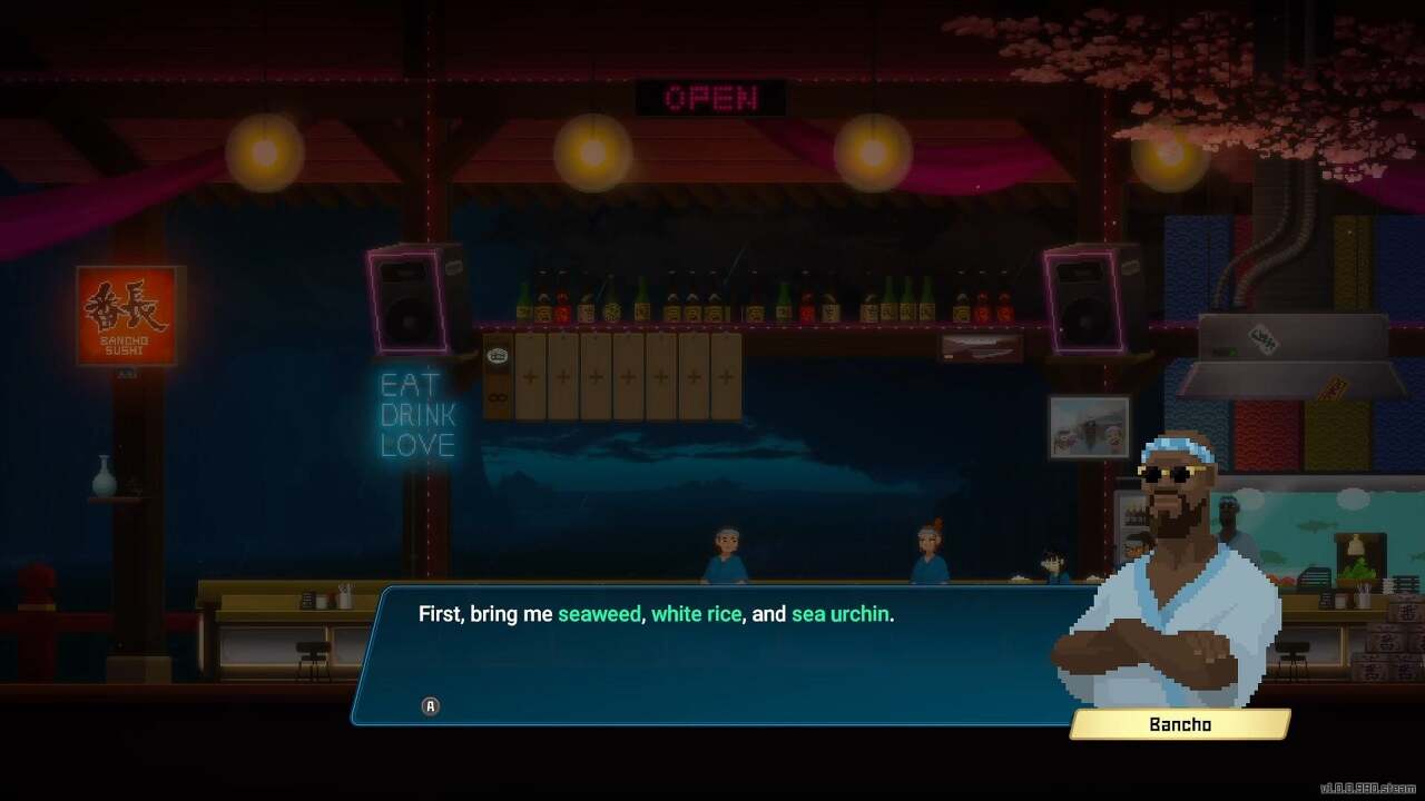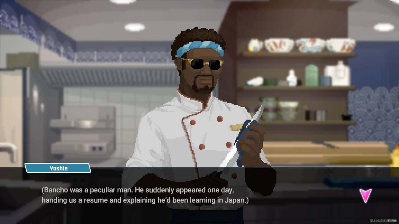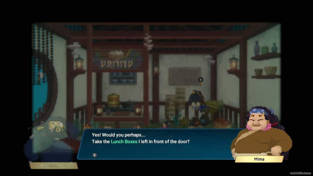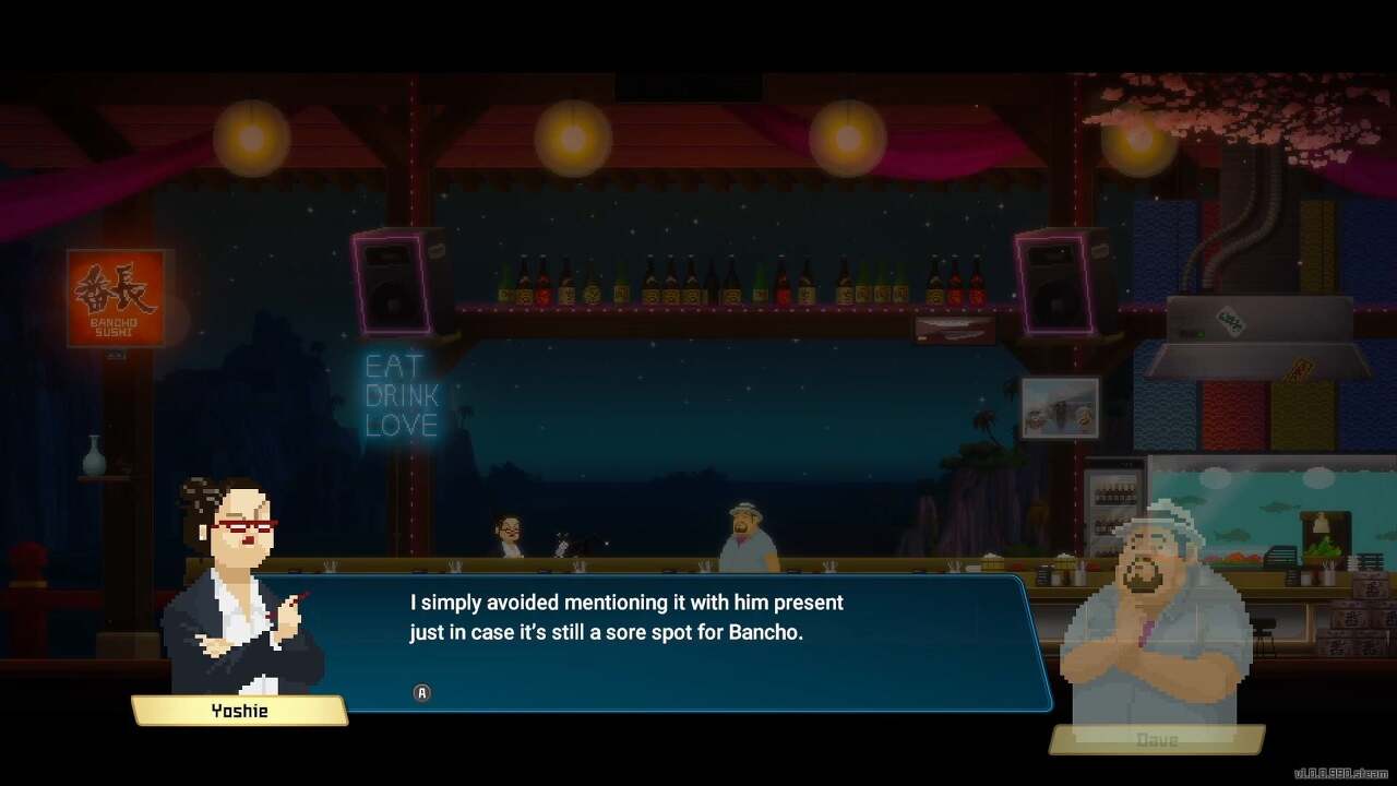 보트로 다시 돌아가지만 반쵸 스시집를 열기에는 너무 늦었습니다. 데이브는 레스토랑을 청소하러 갈 것이고 Yoshie는 불이 켜져 있는 것을 보고 나타날 것입니다. Yoshie는 반쵸의 과거에 대해 이야기하는 데 동의하지만 먼저 그녀에게 맥주를 따라야 합니다. 그녀를 섬기면 그녀는 반쵸의 이야기를 들려줄 것입니다. 게임의 이 섹션은 비주얼 노벨이나 RPG처럼 진행됩니다. 다양한 대화 옵션 중에서 선택하게 되지만, 무엇을 하든 스토리는 같은 방식으로 진행됩니다.