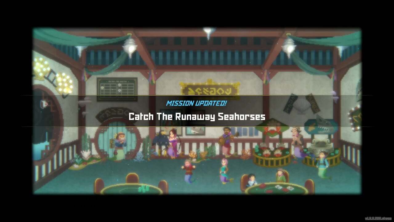 마을 오른쪽에 있는 Game Parlor로 가세요. Game Parlor에 들어가서 Linchen과 대화하세요. 그녀는 도망친 해마 네 마리를 잡아달라고 요청할 것입니다. 도망친 해마 두 마리가 바다사람 마을 아래층에서 앞뒤로 움직이는 모습을 볼 수 있습니다. 다른 하나는 씨앗 가게에서 찾을 수 있고, 마지막 하나는 마을 위쪽에 있는 텐진의 집 안에 있습니다.