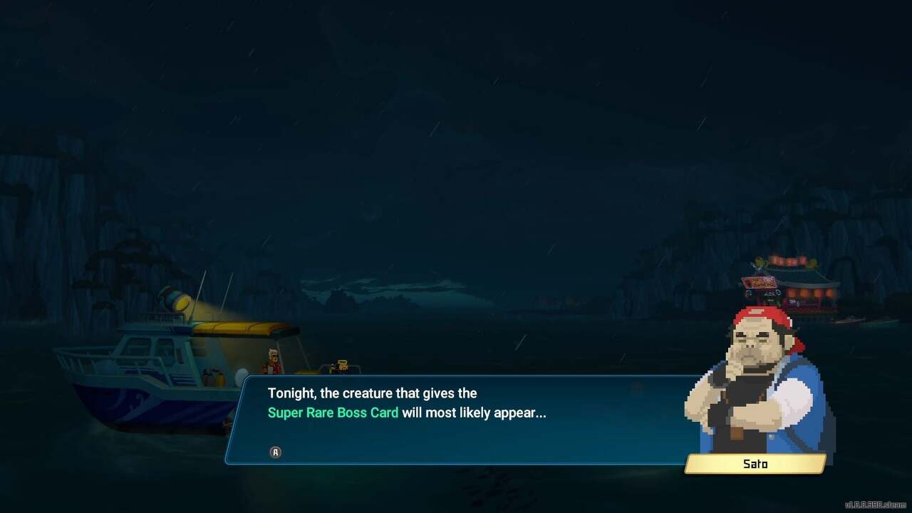 다음에 폭풍이 몰아칠 때 배를 탔을 때, 사토는 폭풍우가 치는 밤에 다이빙을 하면 희귀한 보스가 나타난다고 알려줄 것입니다. 그것을 찾으려면 거대 블루홀 어딘가에 나타나는 소용돌이에 들어가야 합니다. 다른 제출 임무와 달리 이 임무는 받은 날 완료해야 합니다. 그렇지 않으면 사라집니다 . 준비하세요. 하지만 올바른 무기를 선택하는 데 스트레스를 받지 마세요. 이번 보스전에서는 별로 중요하지 않습니다. 준비한 다음 다이빙하세요.