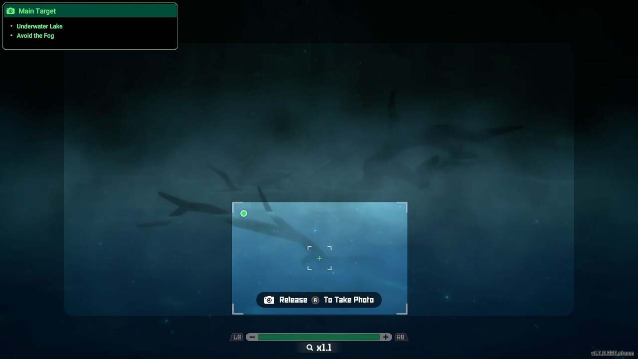 호수 중앙으로 가서 카메라 아이콘과 상호작용하여 사진을 찍으세요. 좋은 사진을 얻으려면 완전히 확대하고 안개를 피하기 위해 프레임 하단 근처를 겨냥하십시오. 액자 왼쪽 상단 모서리의 표시등이 녹색으로 바뀌면 사진을 찍으세요.