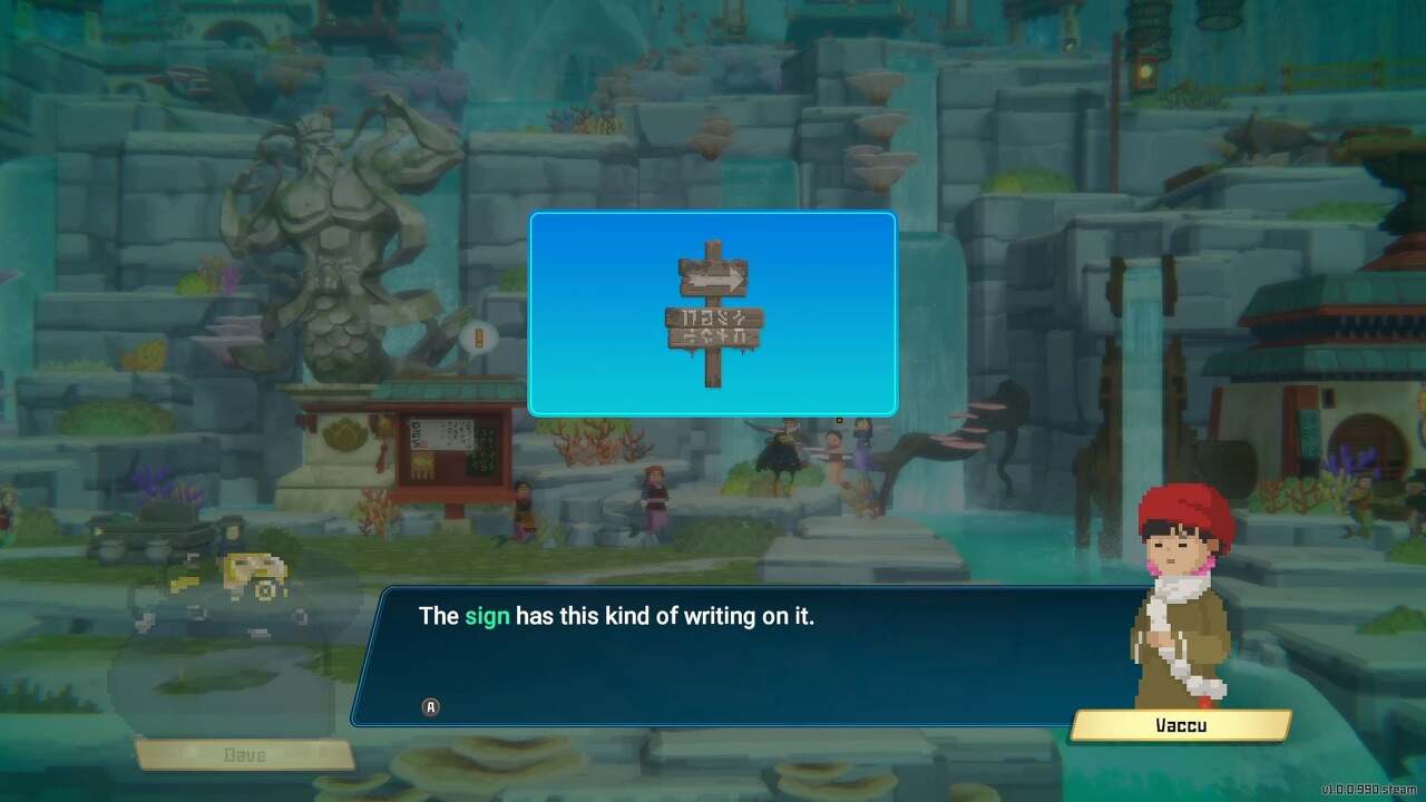 롱왕의 동상에 꽃바치기 완료 후 바다민족 마을 왼편 씨앗상점에 있는 카진에게 돌아가면 카진이 또 다른 일을 맡길 것입니다. 이번에는 사원에 있는 니아모에게서 책을 구해오라고 합니다. 포탈을 타고 바다 사람들 마을 상부로 이동한 후 사원에 들어가 니아모와 대화하세요. 데이브는 책 제목을 기억하지 못하므로 Niamo는 세 가지 선택 사항을 제시합니다. 오른쪽에 있는 것(표지에 왕이 싸우는 것)을 선택한 다음 카진에게 돌아갑니다.