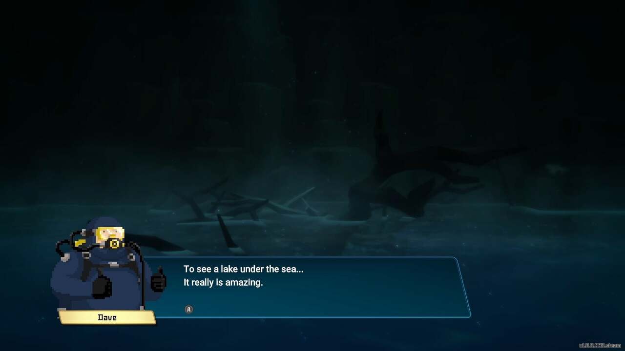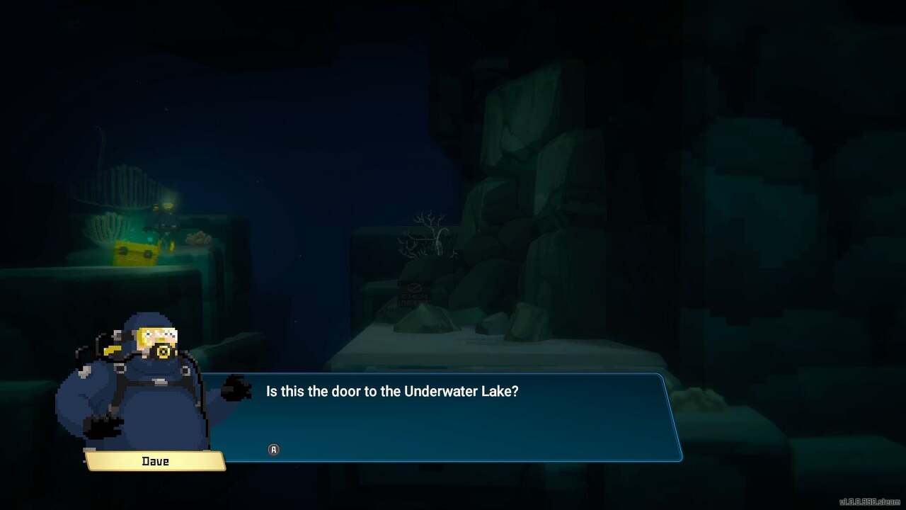 안으로 들어가면 바닥과 천장에 있는 뾰족한 산호초를 지나 헤엄쳐 내려가 오른쪽 아래로 길을 따라 가세요. 수중 호수(Underwater Lake)에 도착하게 됩니다. 별 의미는 없지만 멋져 보입니다. 데이브가 사진 촬영을 제안합니다.