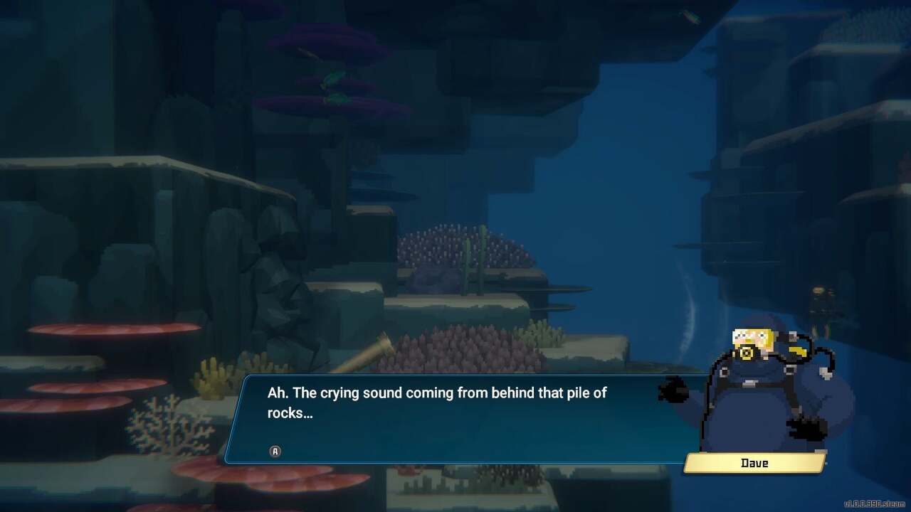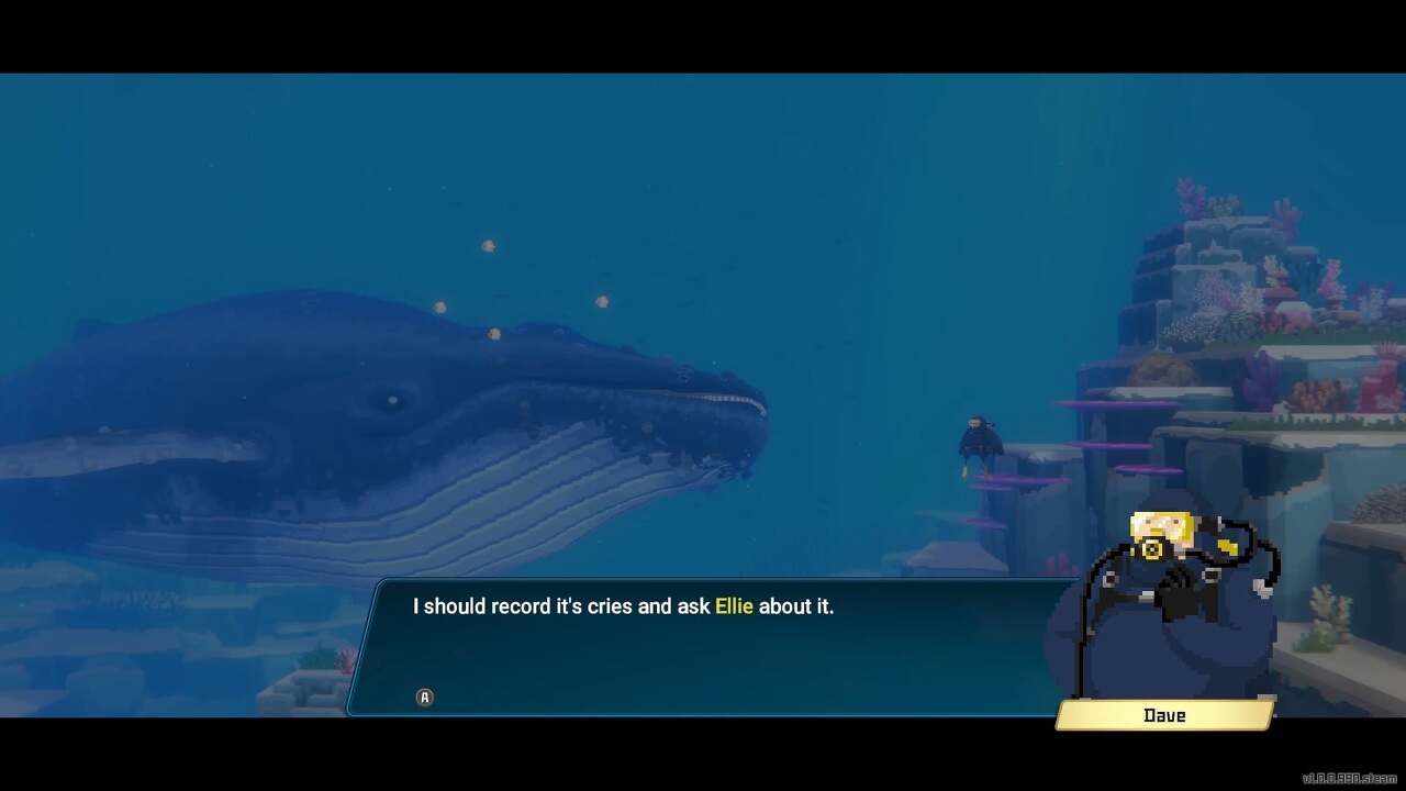 다이빙을 하다 보면 아까 봤던 혹등고래도 다시 만나게 됩니다. 뭔가 말하려는 것 같지만 데이브는 무엇을 말하려는지 확신하지 못합니다. 다음에 보트로 돌아올 때 Ellie에게 전화하세요. 그녀는 고래가 새끼를 찾고 있다고 말하고, 아기 고래의 울음소리를 주의깊게 살펴보라고 요청할 것입니다. 이로써 퀘스트가 완료되고 아기 고래 찾기가 시작됩니다.