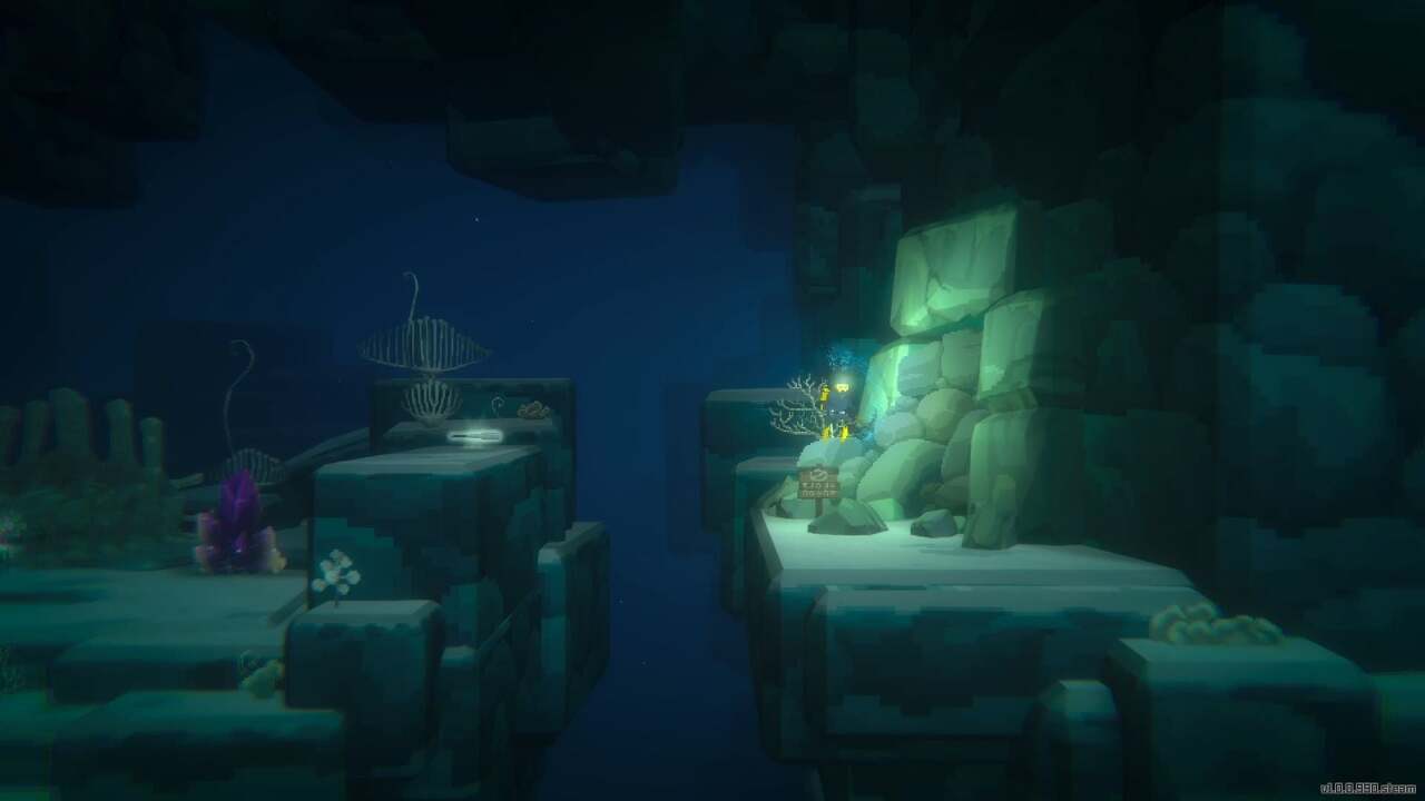 계속 진행하려면 곡괭이가 필요하지만 바로 옆에 있는 노란색 보급 상자에 곡괭이가 있어야 합니다. 상자를 열고 곡괭이를 집어들고 헤엄쳐 바위 위에서 사용하세요. 몇 번 스윙하면 길이 열립니다. 안으로 들어가세요.
