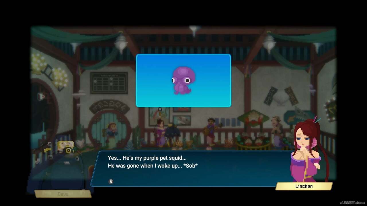 Game Parlor로 돌아가 Linchen과 대화하여 그녀의 사랑스러운 보라색 애완 오징어인 Selgio가 사라졌다는 사실을 알아보세요. 그는 빛나는 해파리를 따라갔고 이제 사라졌습니다. 린첸은 고급 음식을 주고 그를 찾아달라고 부탁할 것입니다.