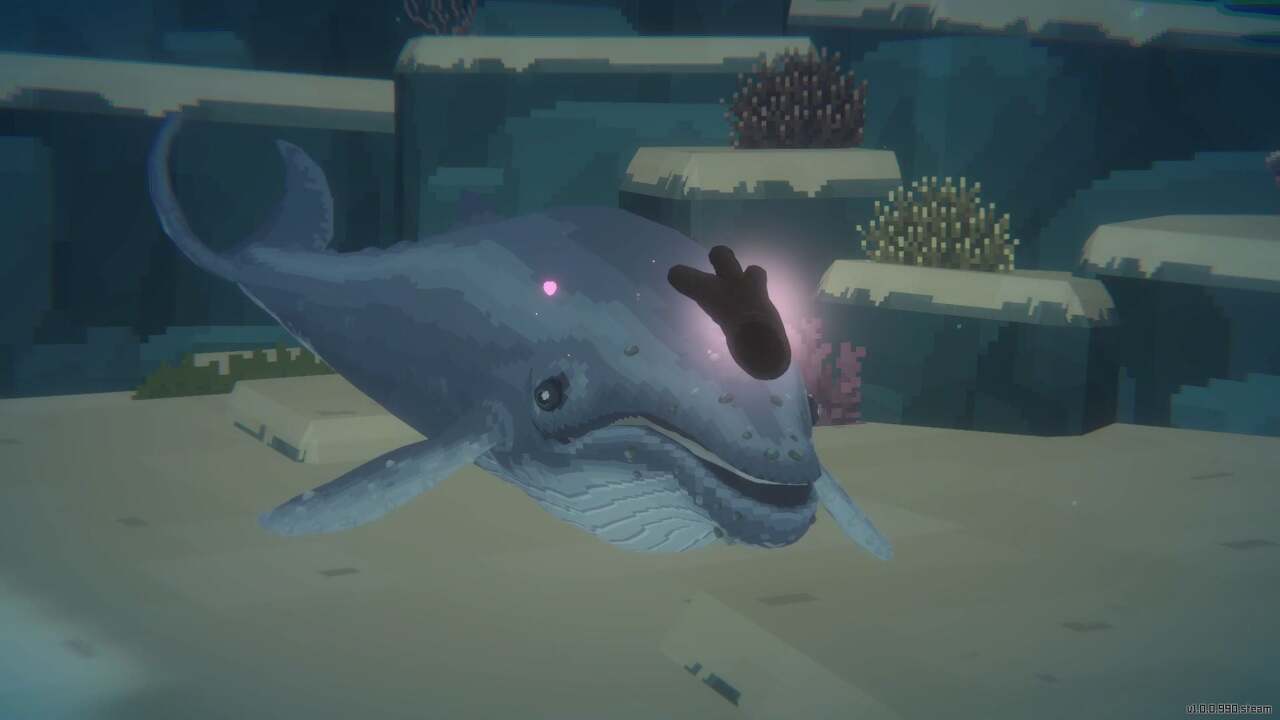 말뚝을 제거한 후 동굴 안으로 들어가세요. 안에 갇혀 있는 아기 고래를 발견하게 되지만 데이브는 조금 겁을 먹습니다. 그것을 위로하려면 그에게 다가가서 스페이스 바 또는 X/사각형으로 상호 작용한 다음 마우스나 왼쪽 아날로그 손을 사용하여 몸 위로 손을 움직여 쓰다듬어 보세요. 도움이 되겠지만 여전히 두렵습니다. 당신을 신뢰하도록 두 번 더 쓰다듬어 보세요. 그렇게 되면 그 위에 하트가 나타나는 것을 볼 수 있고, 두 사람은 동굴을 떠날 것입니다.