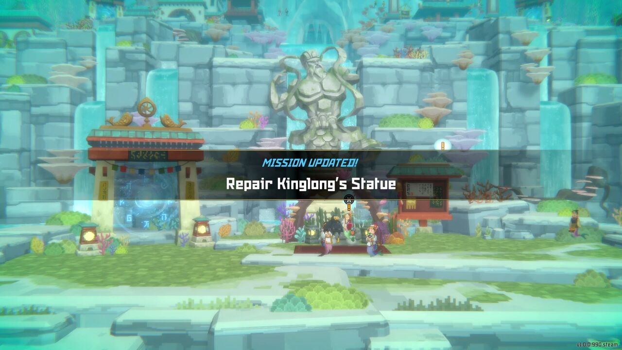 니아모와 대화한 후 지상으로 돌아와 코브라와 대화하면 글루건을 줍니다. 글루건을 바다 사람들 마을로 가져간 후 다시 니아모와 대화하여 조각상 수리를 시작하세요. 글루건은 가스 절단기와 똑같은 방식으로 작동합니다. 마우스 오른쪽 버튼(또는 오른쪽 트리거)을 누른 상태에서 전원을 공급하고 마우스나 왼쪽 스틱을 사용하여 글루건이 움직일 때 원 안에 유지되도록 하세요. 수리가 완료 되면 베이 100개와 크레딧 20개를 받습니다 .