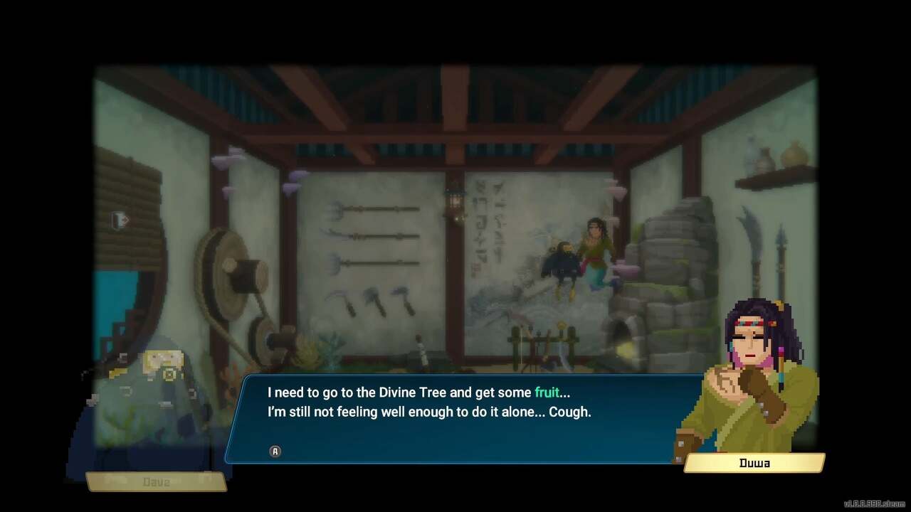 두와는 신나무열매 5개를 골라 바구니에 담아달라고 부탁합니다. 그는 여기에 1분 동안만 머무를 수 있으며, 시간이 지나면 오른쪽으로 이동하기 때문에 과일을 따고 나면 쫓아가야 합니다. 과일을 따려면 그 위로 가서 마우스 오른쪽 버튼이나 오른쪽 트리거를 누른 다음 과일을 Duwa로 가져간 다음 마우스 오른쪽 버튼이나 오른쪽 트리거를 놓아 바구니에 떨어뜨리세요. 제자리에 있으면 신성한 나무로 돌아가서 다른 것을 선택하세요. 5개를 선택하면 작업장으로 다시 이동됩니다.