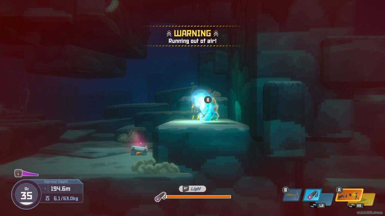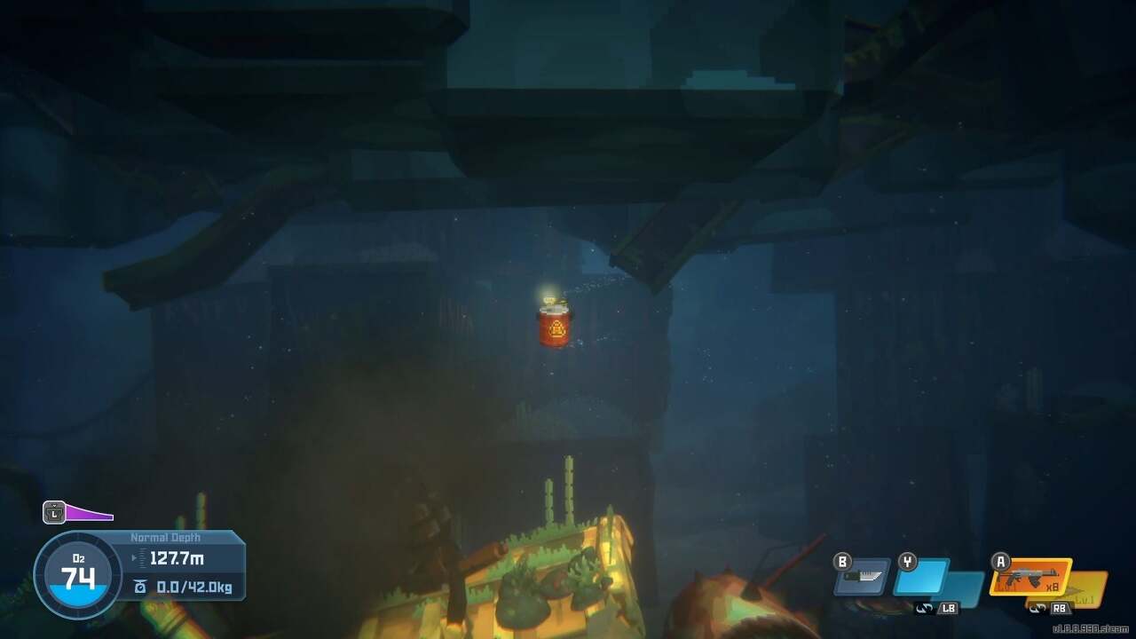 아기 고래를 찾으러 간다면 총을 가져가고 싶을 것입니다. 이번 미션 후반부에는 물고기가 많이 등장하는데, 물고기들이 극도로 적대적입니다. 아기고래를 찾으려면 약 70m 아래로 내려가세요. 수심 50미터쯤 되면 아기 고래의 울음소리가 들립니다. 소리를 따라 70미터 아래로 내려가면 지도 왼쪽의 동굴에서 소리가 나오는 것을 볼 수 있습니다. 문제는 동굴이 말뚝으로 고정된 바위로 막혀 있다는 것입니다. 무엇을 해야 할지 아실 겁니다. 스테이크로 가서 마우스 오른쪽 버튼이나 오른쪽 트리거로 스테이크를 잡고 움직이는 바가 빨간색 부분에 닿으면 스페이스바나 A/x 버튼을 누르세요.