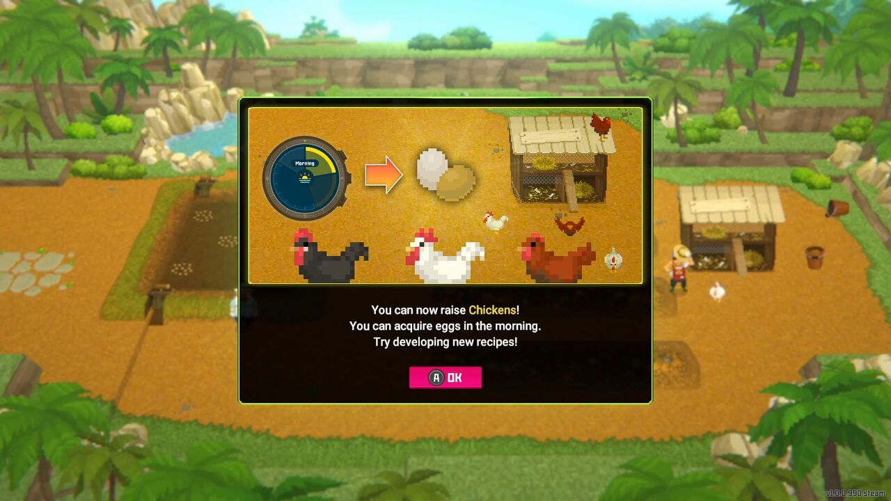 다음날 오토에게서 전화가 옵니다. 농장으로 가서 새미가 잠시 머물면서 닭 사육을 돕기로 결정했다는 사실을 알아보세요. 닭은 하루에 한 개의 알을 낳습니다. 계란에는 A 등급과 B 등급이 있습니다. A 등급 계란은 품질이 더 좋고 고품질 닭에서 생산될 가능성이 더 높습니다. 처음에는 B등급 계란을 주는 닭 한 마리로 시작하지만, Bancho Sushi의 메뉴에 풍미를 더하고 싶다면 새미에게서 닭을 더 구입할 수도 있습니다.