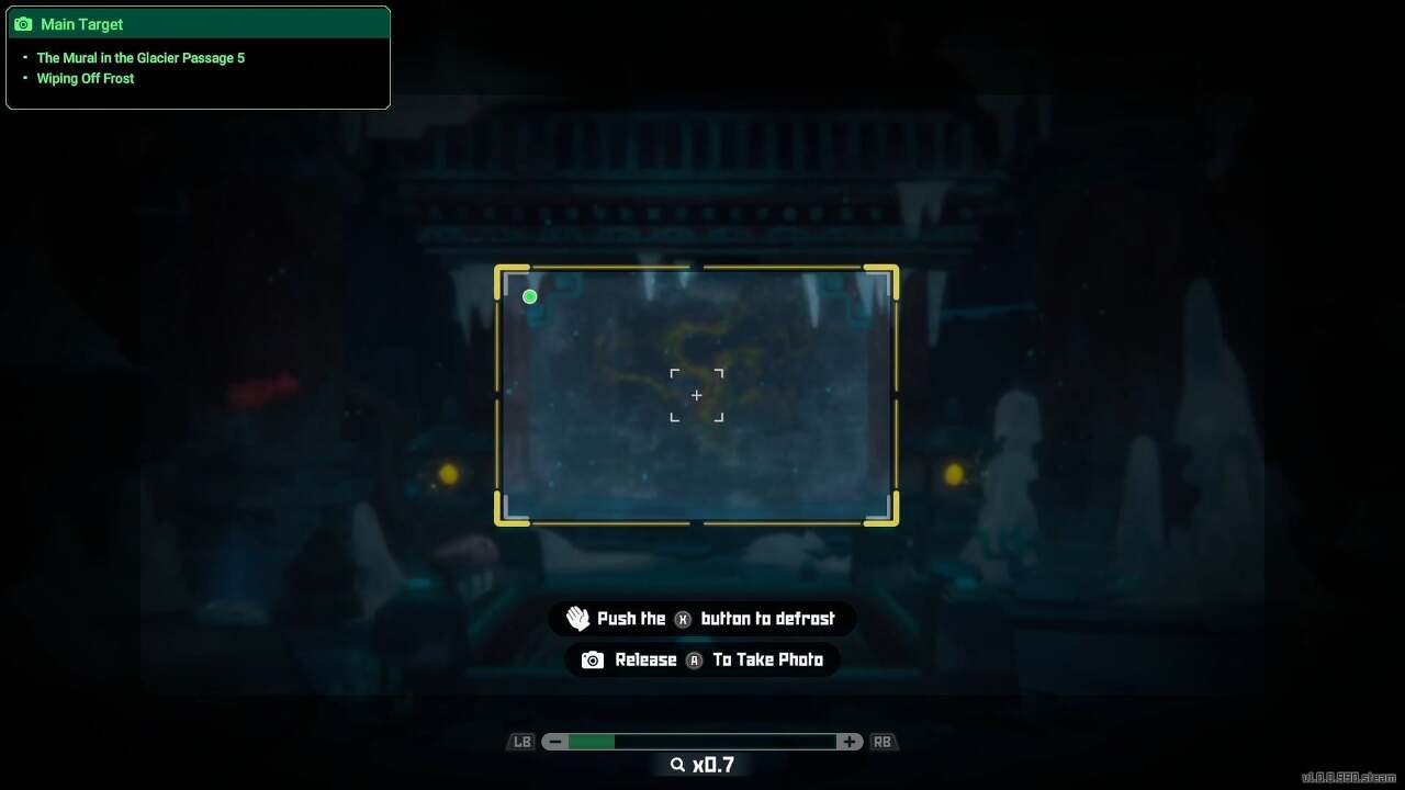 이제 모든 작업이 완료되었으므로 다음 레벨로 이동하는 것을 막고 있는 얼음을 녹여야 합니다. 그 전에 이 방의 벽화 사진을 찍어보세요. 카메라는 올바른 위치에서 시작되므로 왼쪽 상단의 녹색 표시등이 켜질 때까지 축소하고 사진을 찍으세요.