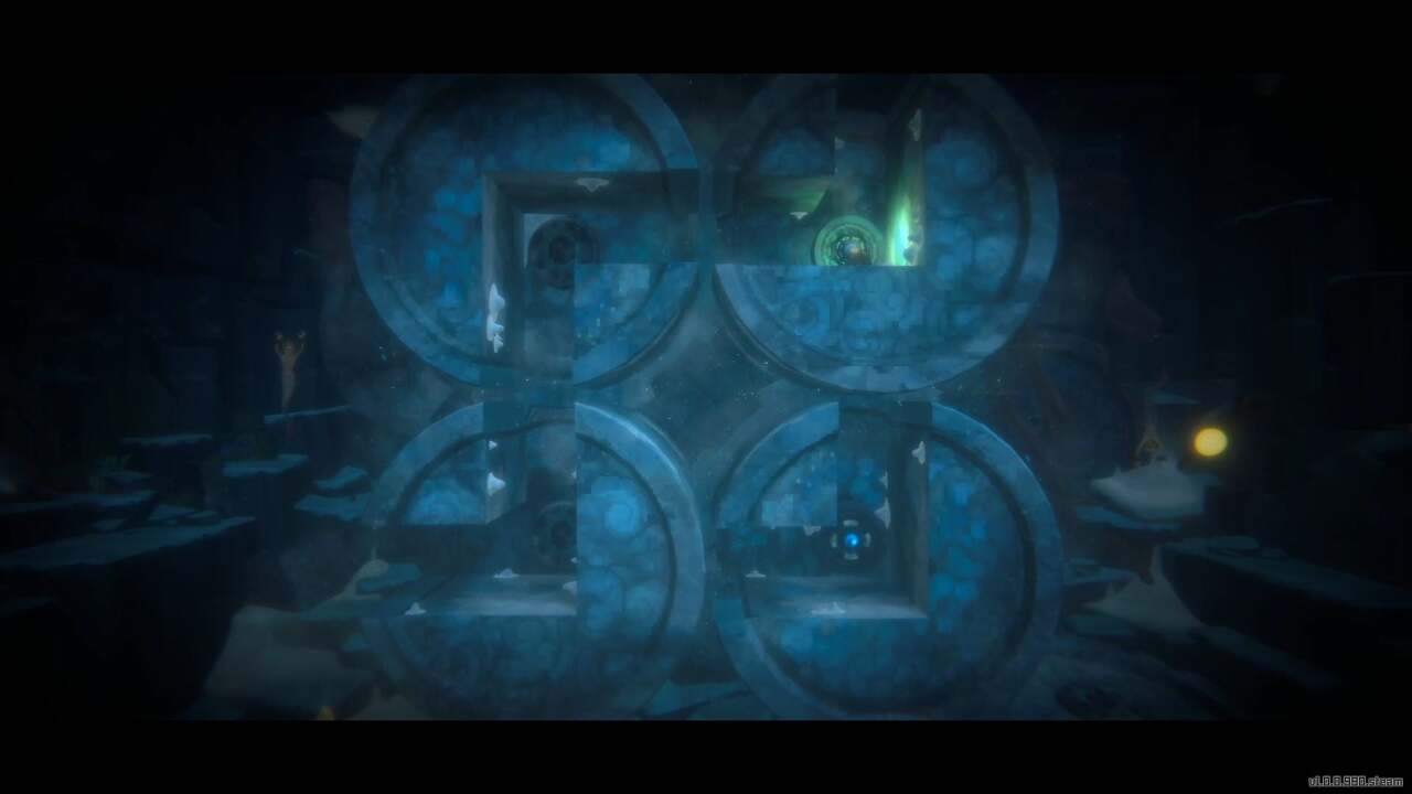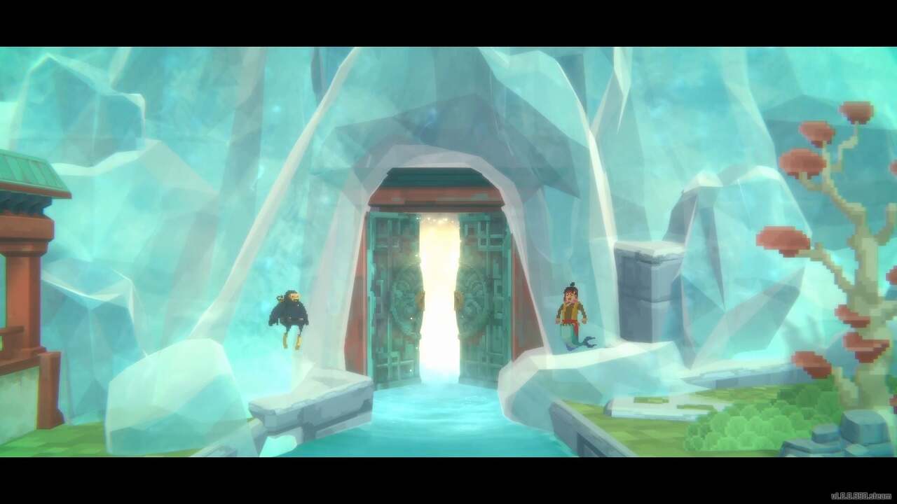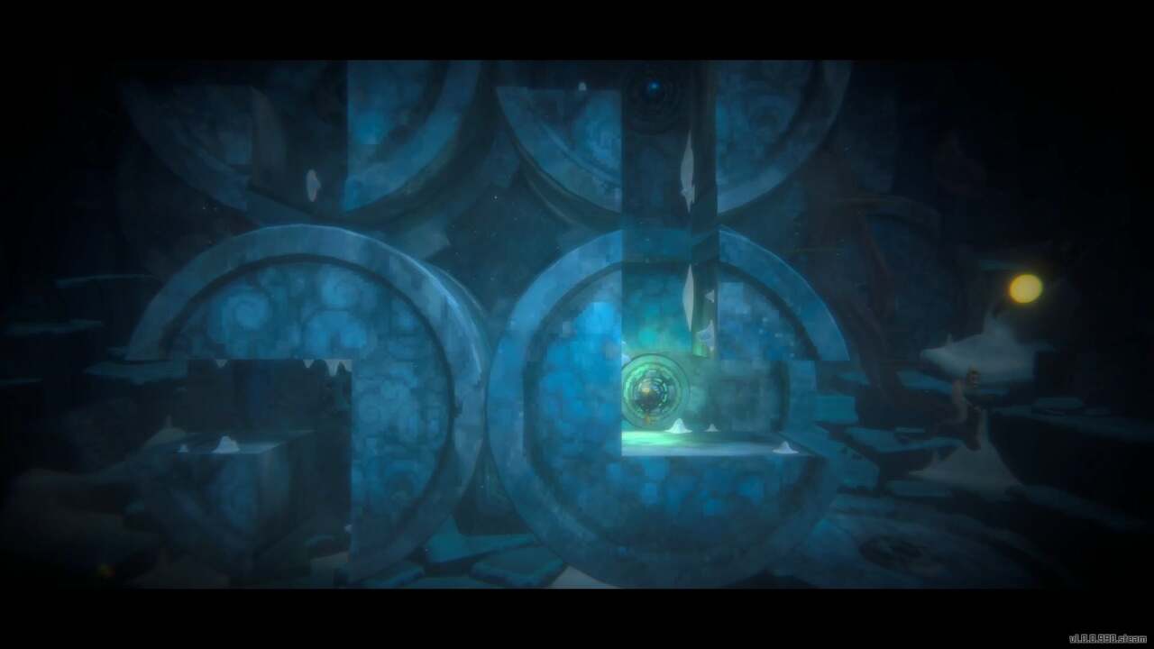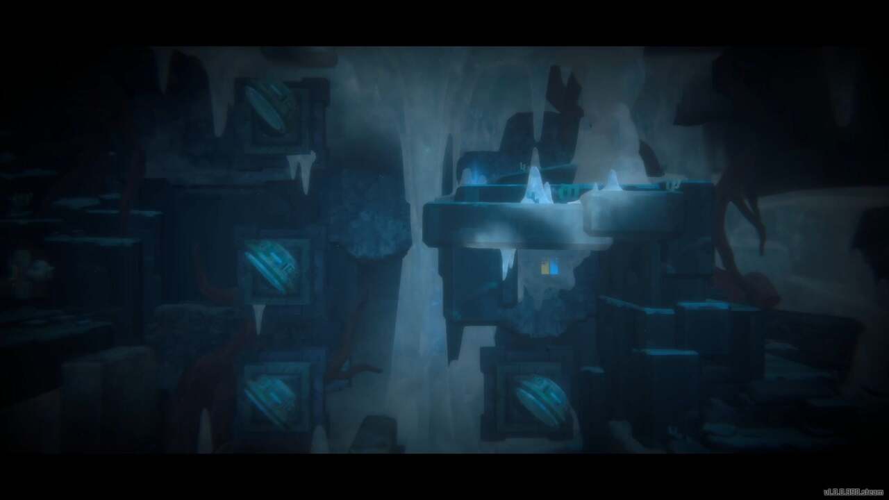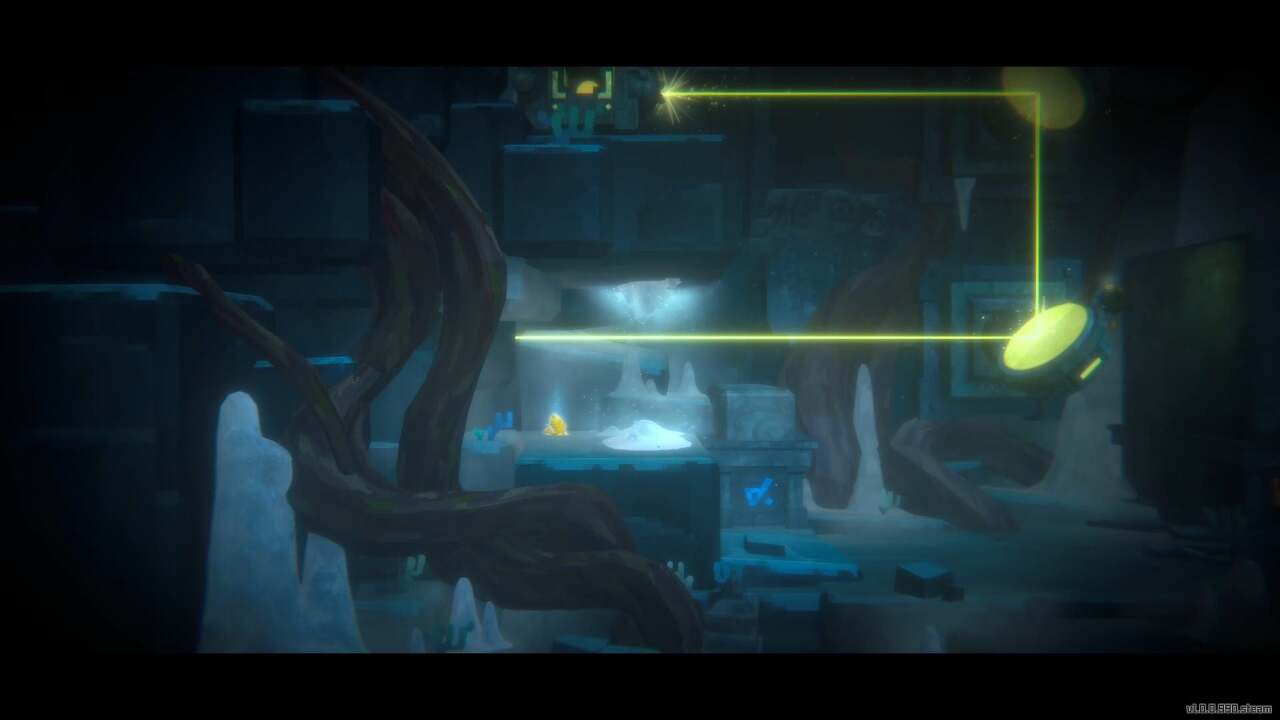 다음 방은 여러 개의 회전 가능한 거울로 가득 차 있으며 진행 과정은 얼음 벽으로 막혀 있습니다. 또 다른 레이저 퍼즐을 할 시간입니다. 먼저 아래로 내려가 땅에서 신성한 나무 열매를 집은 다음 해당 지역 왼쪽에 있는 장치에 떨어뜨립니다.