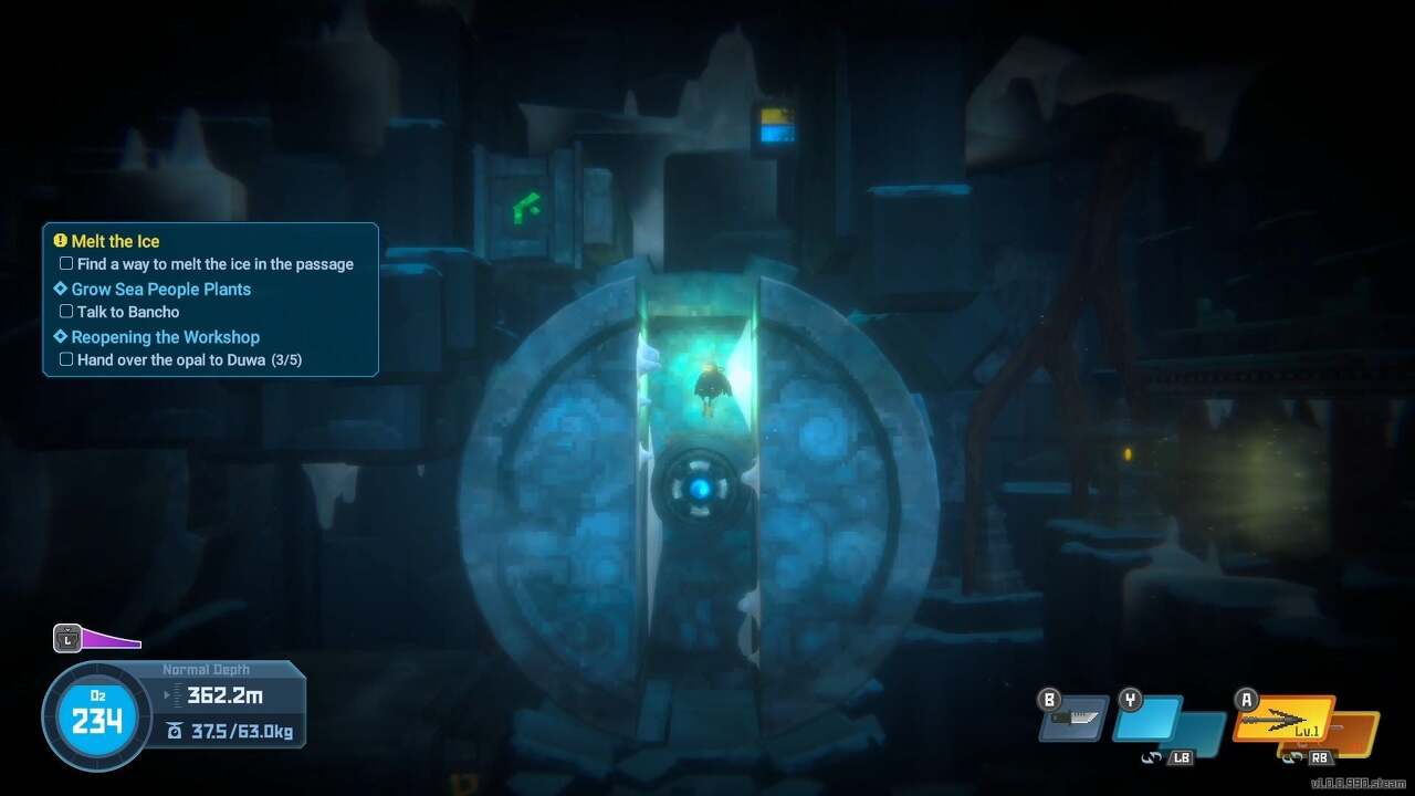앞의 길은 얼음으로 막혀 있지만 데이브는 신성한 나무 열매를 사용하여 얼음을 녹일 수 있다는 것을 깨달았습니다. 신성한 나무 열매까지 수영하여 마우스 오른쪽 버튼이나 오른쪽 트리거로 집어 얼음 위로 가져가서 녹인 후 다음 방으로 진행하세요.