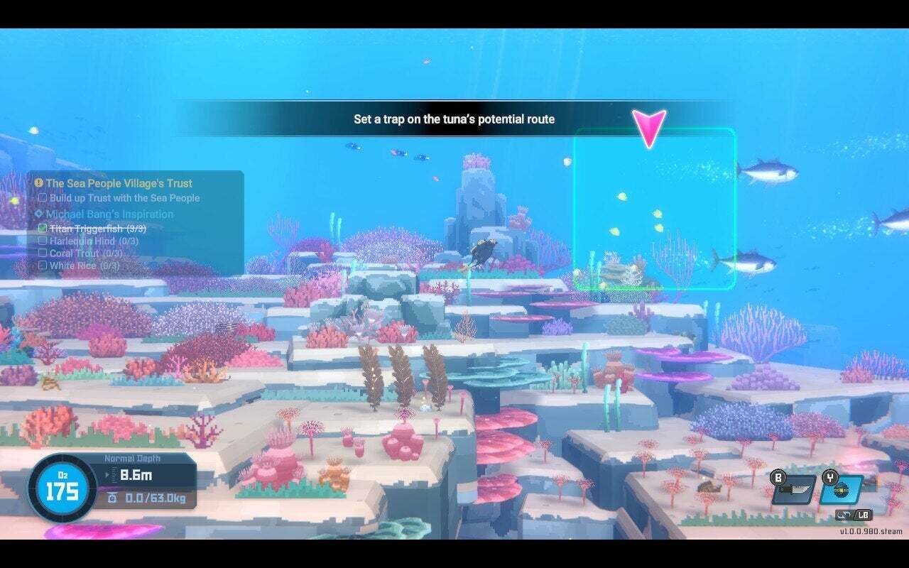 참치를 잡으려면 센서 철망 센서 트랩을 물 속으로 가져가서 컨트롤러의 C 또는 Y와 함께 녹색 사각형으로 표시된 영역에 설치한 다음 참치가 지나갈 때 마우스 휠이나 오른쪽 트리거로 폭발시킵니다. 그런 다음 참치 위로 올라가 드론을 사용하여 스페이스바 또는 X를 눌러 Bancho Sushi로 다시 가져가세요. 이제 참치 파티를 위해 참치를 잡을 수 있고 다이빙 드론의 업그레이드를 구매할 수 있습니다. 또한 Cobra Shop에서 트랩 센서 폭탄을 구입할 수도 있습니다.