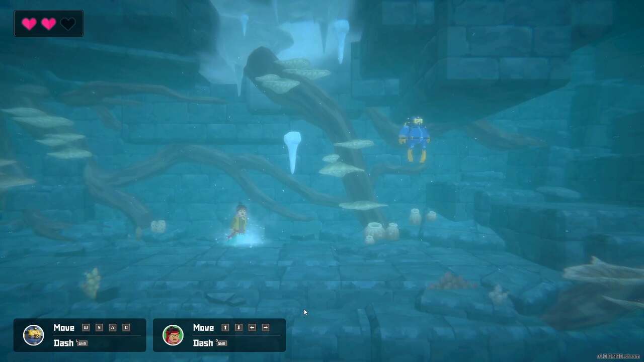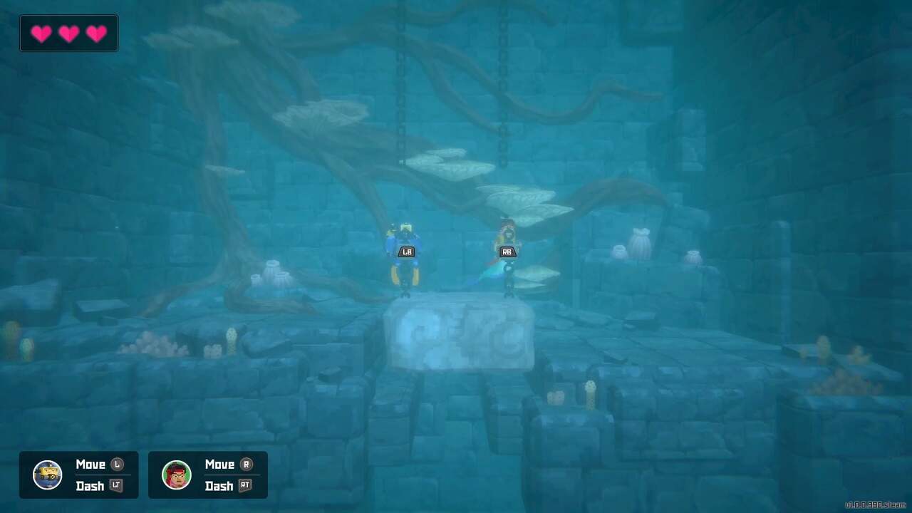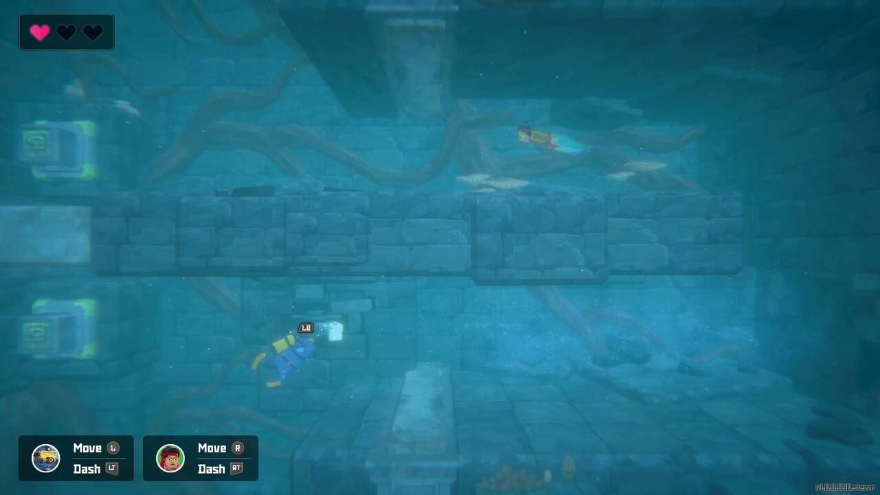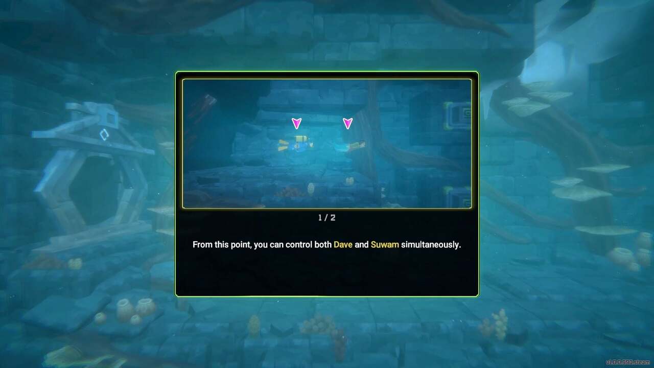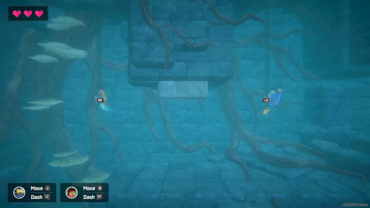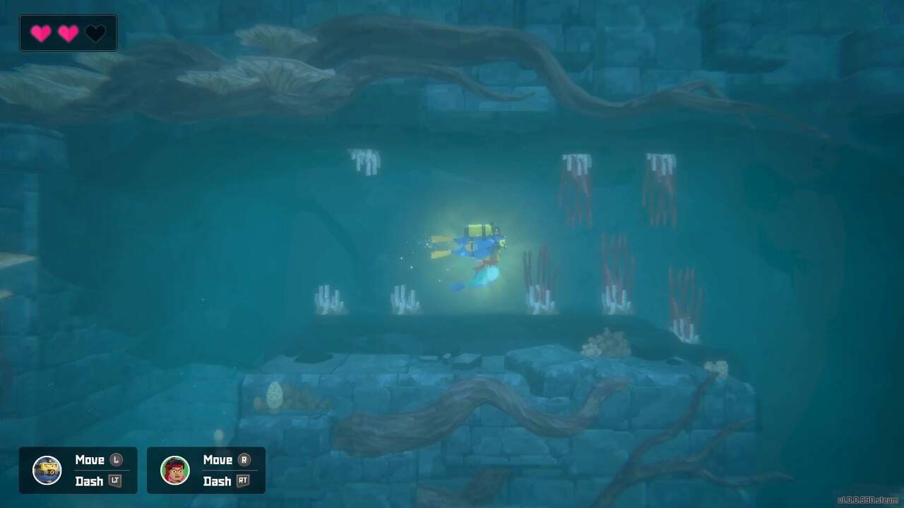 이 시점부터 데이브와 Suwam을 동시에 제어하게 됩니다. WASD 키나 왼쪽 아날로그 스틱으로 데이브를 제어하고 왼쪽 Shift 키나 왼쪽 트리거로 대시를 제어할 수 있습니다. 화살표 키나 오른쪽 아날로그 스틱으로 Suwam을 제어하고 오른쪽 Shift 키나 오른쪽 트리거로 대시를 제어합니다. 이 제어 방식은 익숙해지는 데 다소 시간이 걸릴 수 있으므로 처음에는 느낌이 들 때 천천히 진행하세요. Suwam은 또한 관벌레를 수축시키는 능력을 가지고 있으며 조류에 맞서 헤엄칠 수 있습니다. 또한 데이브와 Suwam 사이에는 세 개의 하트가 나누어져 있습니다. 즉, 죽기 전에 총 세 번의 히트만 할 수 있다는 의미입니다.