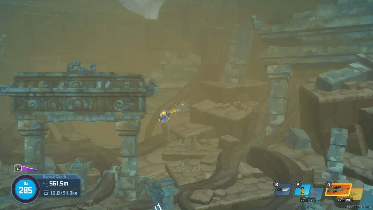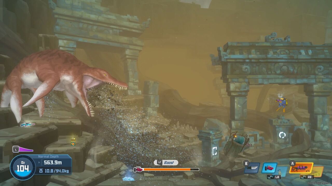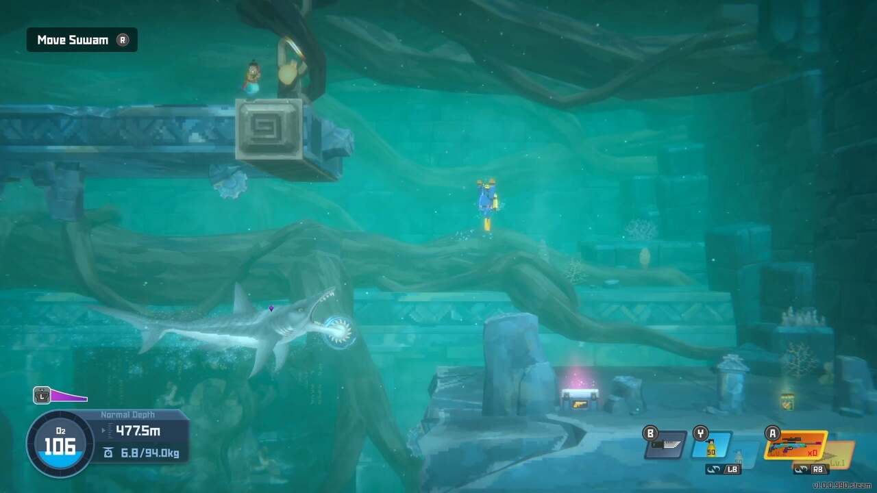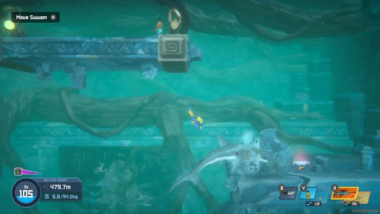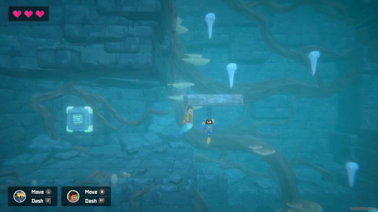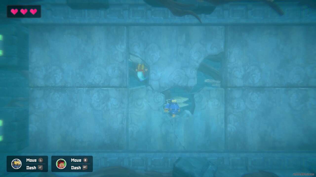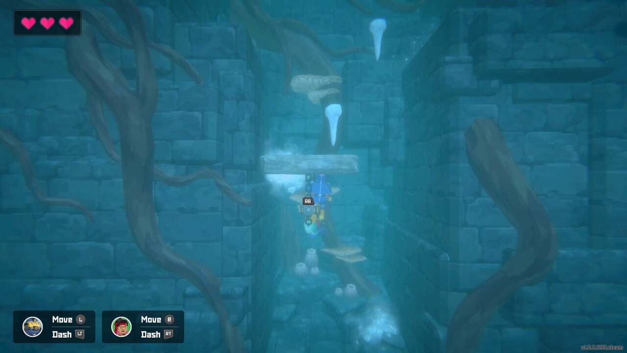 이 시점부터 데이브와 Suwam을 동시에 제어하게 됩니다. WASD 키나 왼쪽 아날로그 스틱으로 데이브를 제어하고 왼쪽 Shift 키나 왼쪽 트리거로 대시를 제어할 수 있습니다. 화살표 키나 오른쪽 아날로그 스틱으로 Suwam을 제어하고 오른쪽 Shift 키나 오른쪽 트리거로 대시를 제어합니다. 이 제어 방식은 익숙해지는 데 다소 시간이 걸릴 수 있으므로 처음에는 느낌이 들 때 천천히 진행하세요. Suwam은 또한 관벌레를 수축시키는 능력을 가지고 있으며 조류에 맞서 헤엄칠 수 있습니다. 또한 데이브와 Suwam 사이에는 세 개의 하트가 나누어져 있습니다. 즉, 죽기 전에 총 세 번의 히트만 할 수 있다는 의미입니다.