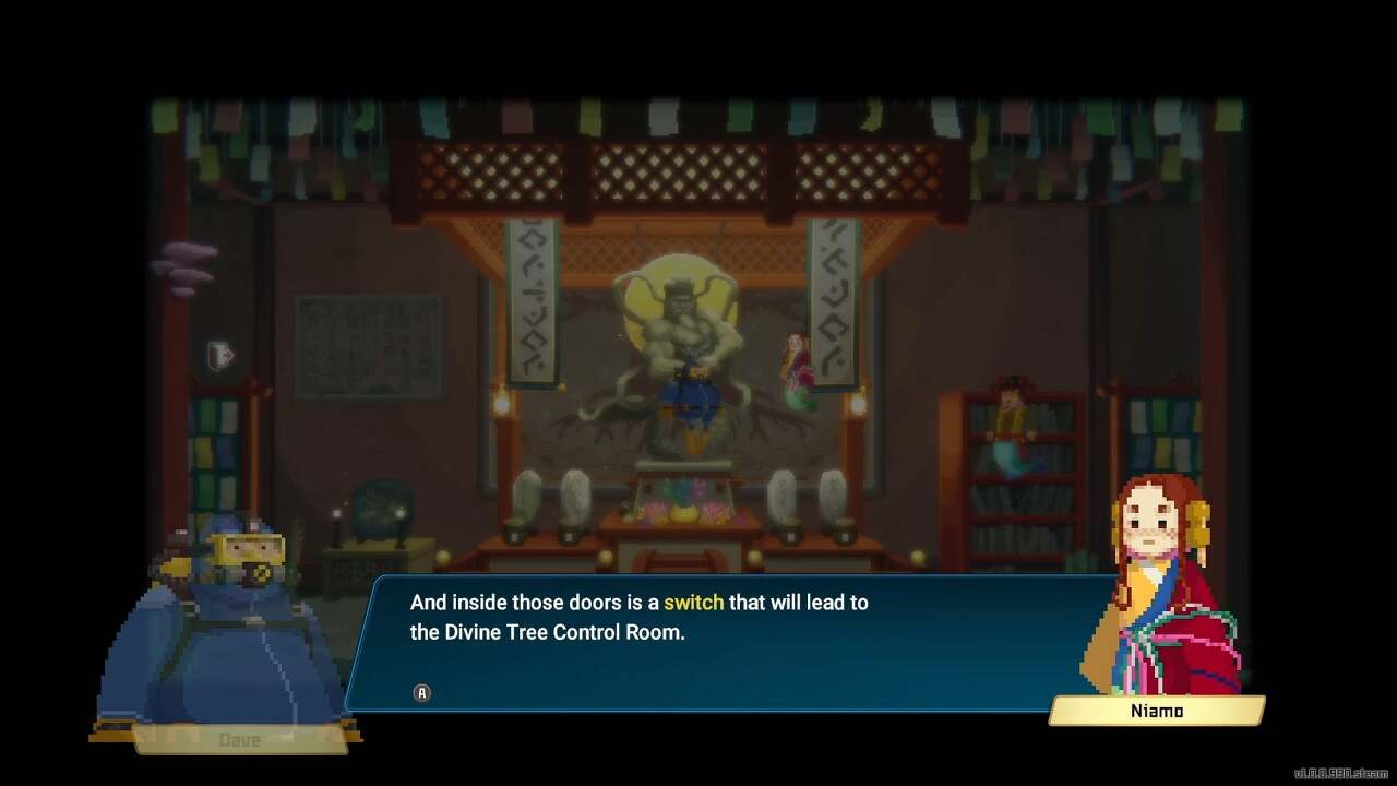 다음 방으로 이동하여 데이브와 Suwam을 버튼 중 하나로 이동합니다. 두 캐릭터가 동시에 버튼을 눌러야 합니다. 그러면 앞에 있는 돌판이 올라가고 통과할 수 있습니다. 데이브가 버튼을 누르도록 하려면 LCtrl 또는 왼쪽 트리거를 사용하고 Suwam의 경우 RCtrl 또는 오른쪽 트리거를 사용하세요.