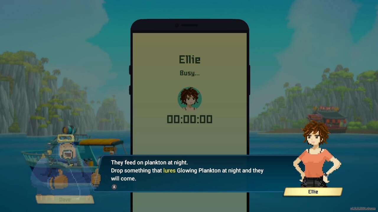 다음 날, Udo로부터 당신이 찍은 사진이 호평을 받았으며 Udo가 또 다른 멋진 사진을 찍는 데 도움이 필요하다는 전화를 받게 됩니다. 이번에는 쥐가오리 사진을 찍고 싶어하는데, 쥐가오리는 밤에만 나타나기 때문에 유인해야 합니다. 데이브와 Udo는 Manta Rays가 무엇을 먹는지 모르지만 Ellie는 알고 있습니다. 그녀에게 전화하세요.