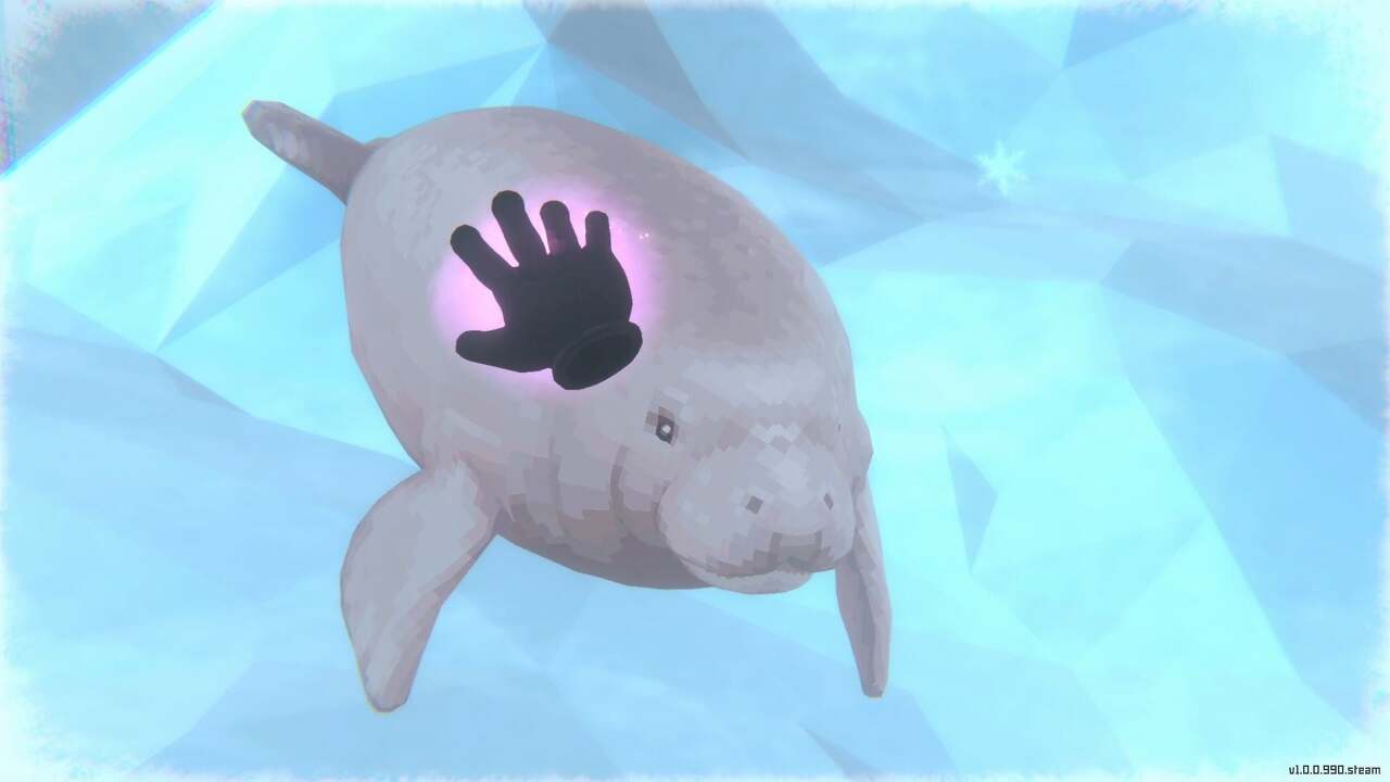 아기 매너티에게 가서 스페이스바나 X/사각형을 사용해 상호작용하세요. 앞서 구한 아기 고래처럼 아기 해우도 쓰다듬어 진정시켜야 합니다. 이번에는 분홍색 원으로 표시된 특정 장소를 쓰다듬어 주어야 합니다. 마우스나 왼쪽 아날로그 스틱을 사용하여 매너티를 쓰다듬어 보세요. 진정되기 전에 세 곳의 다른 장소에서 쓰다듬어 주어야 합니다.