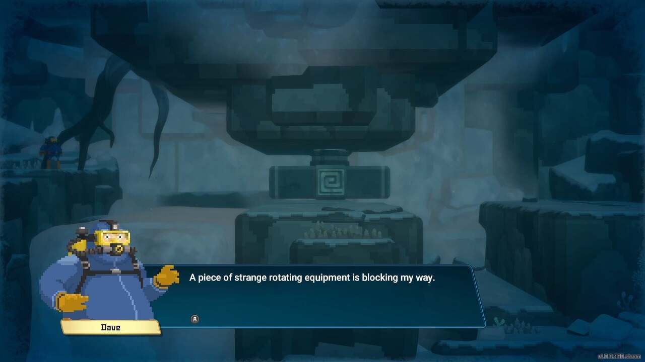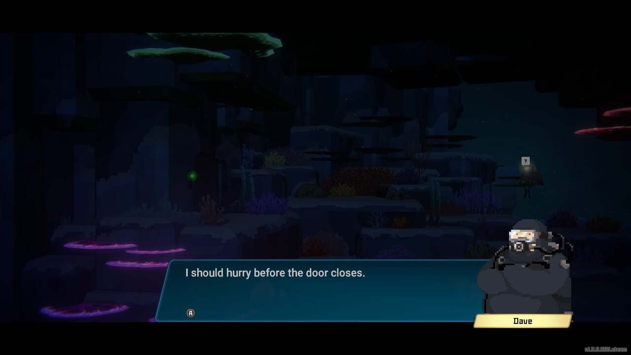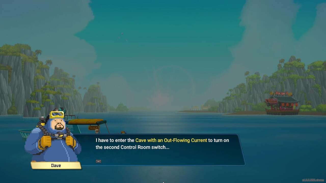 그와 짧은 대화를 나누게 됩니다. 안으로 들어갈 준비가 되면 문으로 헤엄쳐 가서 "수락"을 선택하세요. 일단 안으로 들어가면 위쪽에 물이 없다는 것을 알게 될 것입니다. 위에 있는 스위치를 활성화해야 하므로 데이브는 거기로 올라가야 합니다.