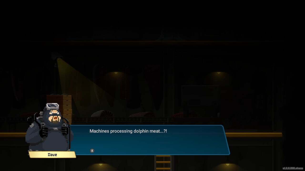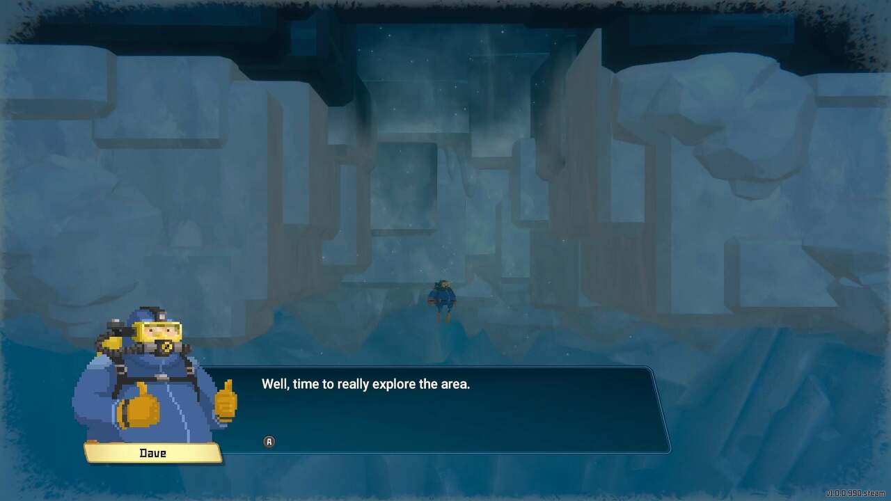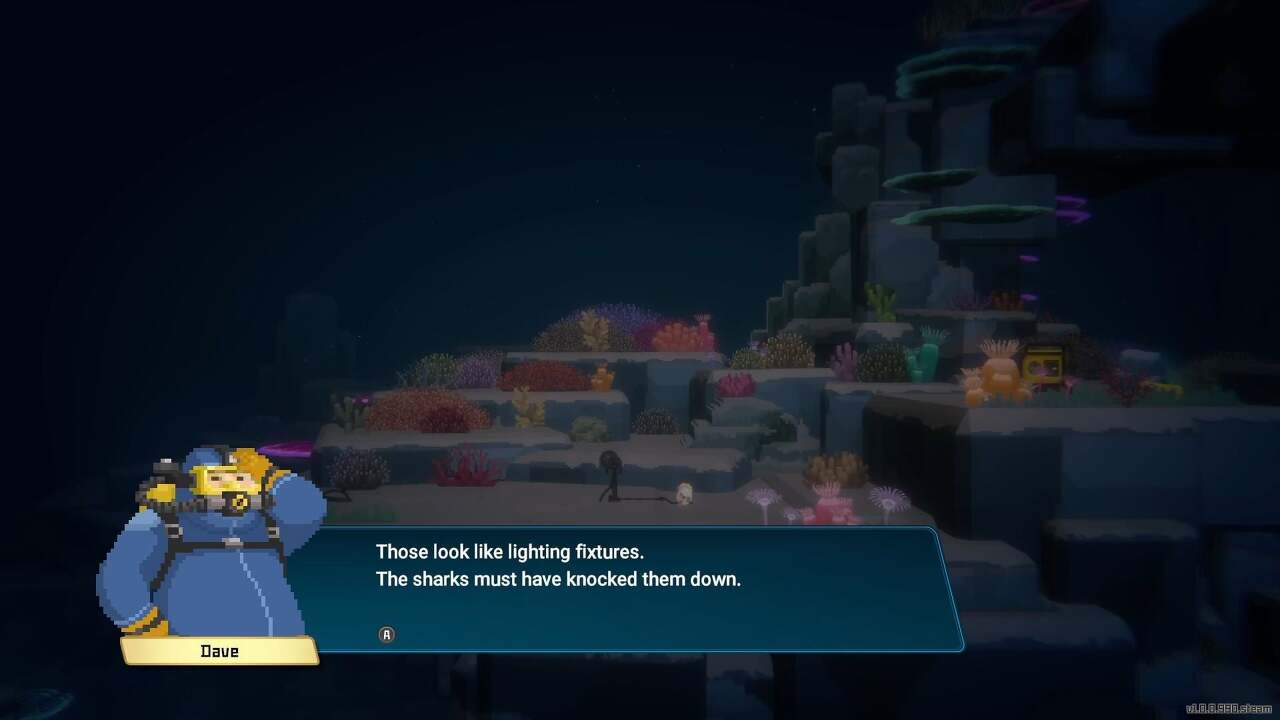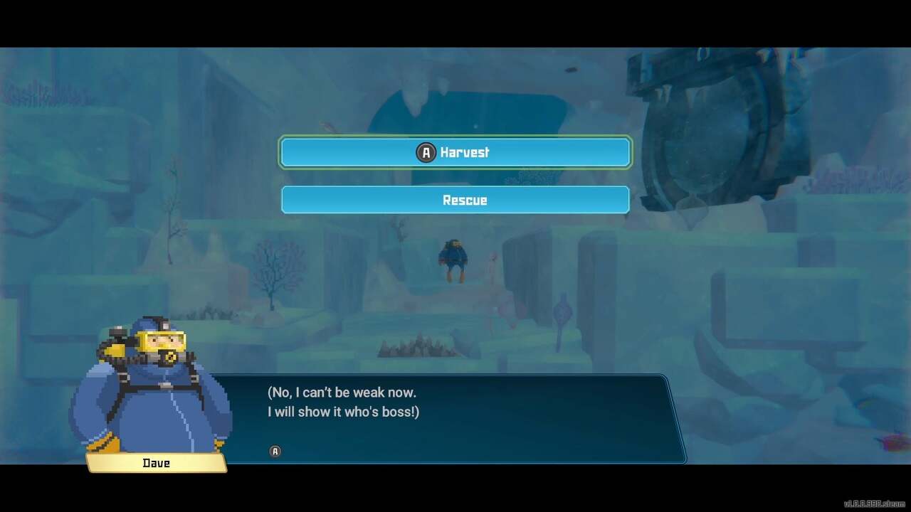 그와 짧은 대화를 나누게 됩니다. 안으로 들어갈 준비가 되면 문으로 헤엄쳐 가서 "수락"을 선택하세요. 일단 안으로 들어가면 위쪽에 물이 없다는 것을 알게 될 것입니다. 위에 있는 스위치를 활성화해야 하므로 데이브는 거기로 올라가야 합니다.