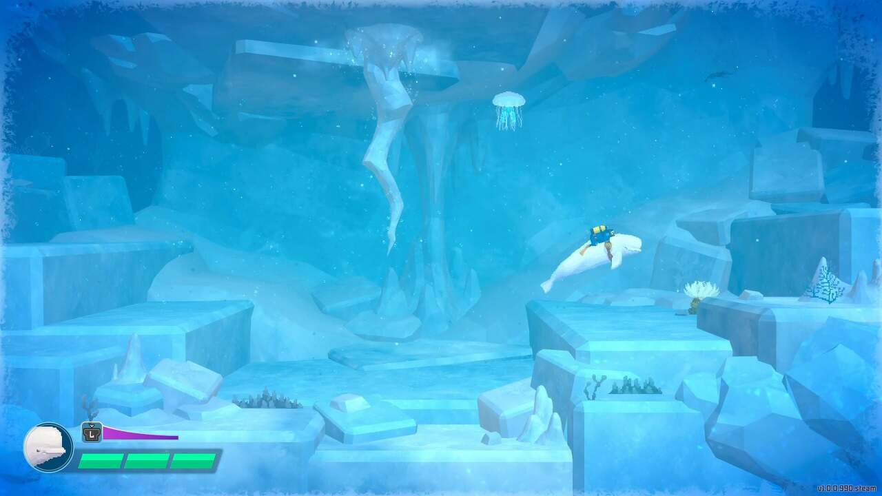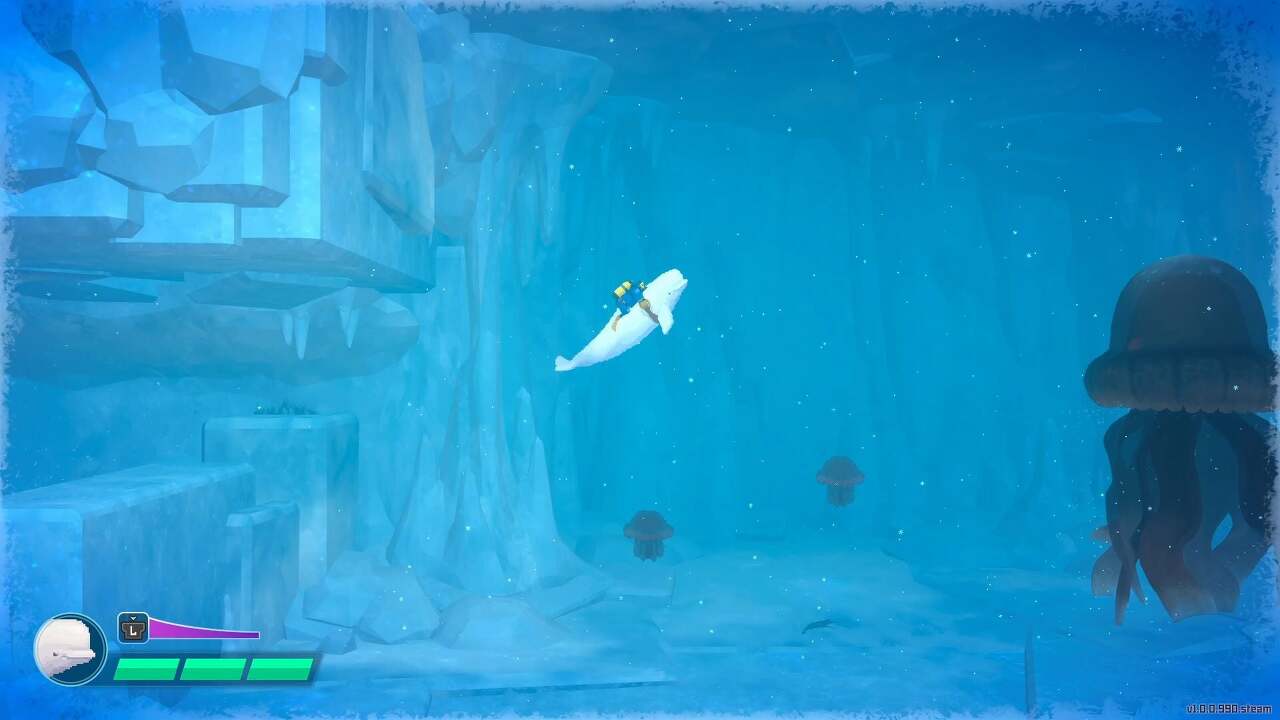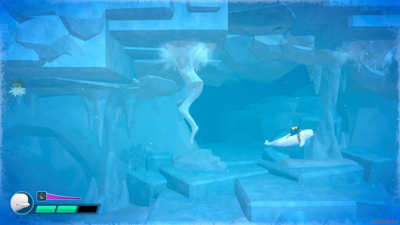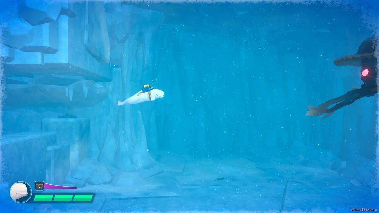 이 동굴에서 벨구아를 조종하게 됩니다. Lctrl이나 왼쪽 아날로그 스틱을 누르면 방해가 되는 장애물을 돌진하고 파괴할 수 있습니다. 벨루가는 체력 막대가 3개 있으며, 맞으면 막대 1개가 제거됩니다. 길에서 보게 되는 새우를 먹으면 체력바 1개를 회복할 수 있습니다.
