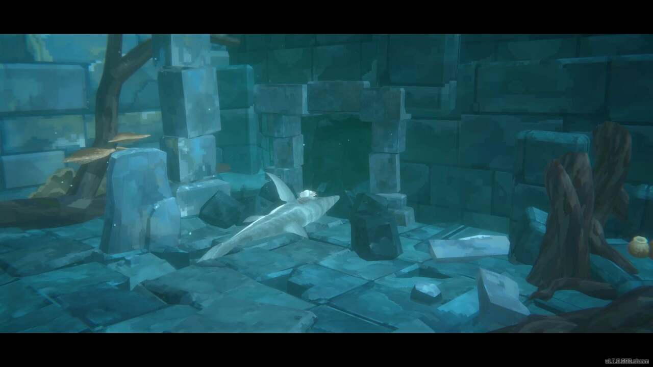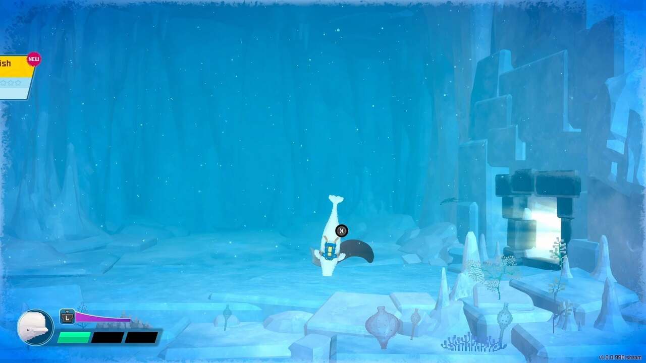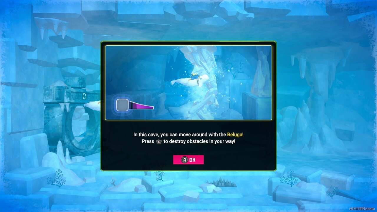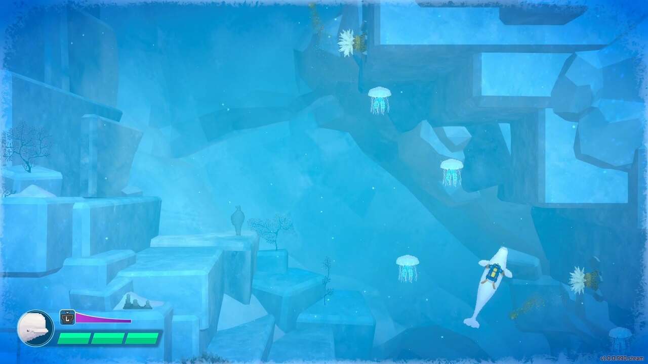 이 동굴에서 벨구아를 조종하게 됩니다. Lctrl이나 왼쪽 아날로그 스틱을 누르면 방해가 되는 장애물을 돌진하고 파괴할 수 있습니다. 벨루가는 체력 막대가 3개 있으며, 맞으면 막대 1개가 제거됩니다. 길에서 보게 되는 새우를 먹으면 체력바 1개를 회복할 수 있습니다.