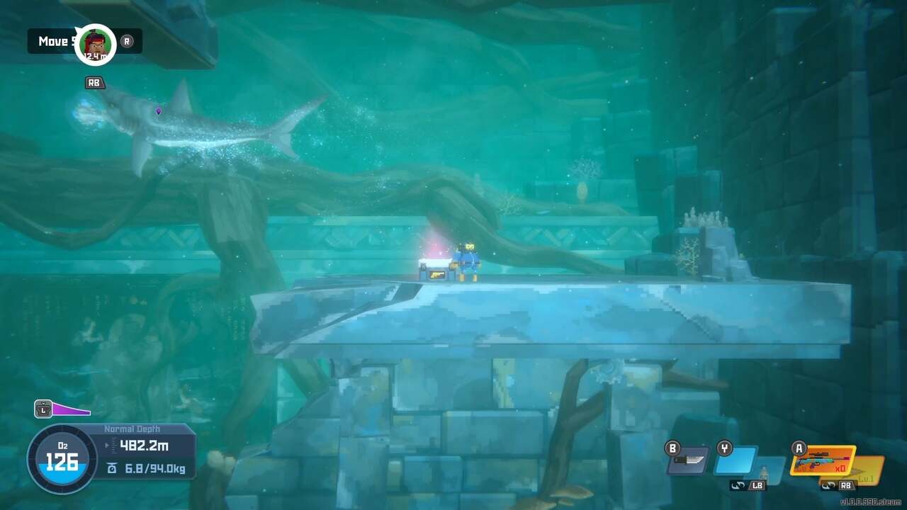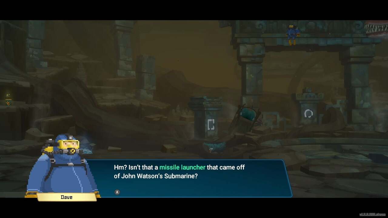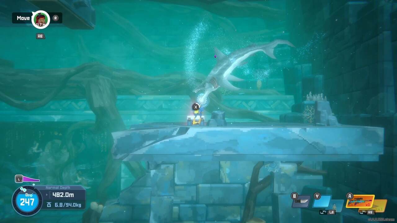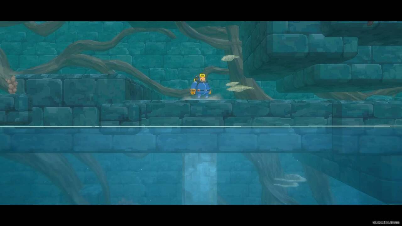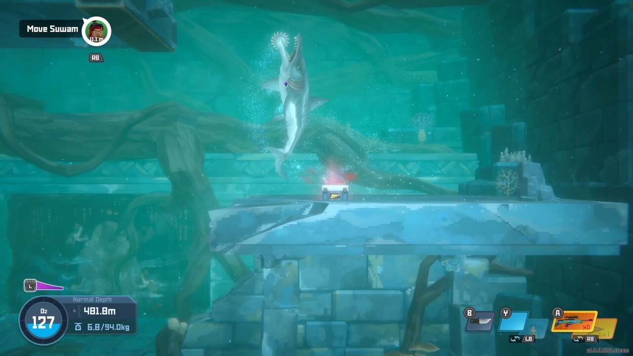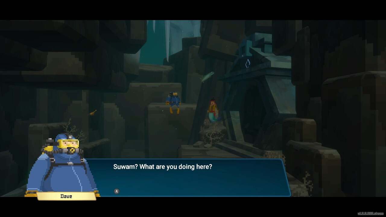 다시 데이브로 전환하고 지금은 닫힌 돌문을 가로질러 걸어가세요. 계속 앞으로 나아가다가 앞에 레버가 보이면 앞쪽 선반을 아래로 내립니다. 그러면 데이브와 Suwam이 모두 레버를 당기는 컷씬이 트리거됩니다(Suwam으로 전환하지 않고 컷씬이 나타날 때까지 앞으로 이동하는 경우). 이렇게 하면 수위가 더 높아지고 아래에 통로가 열립니다. 데이브는 다시 물 속으로 다이빙할 것이고, 그와 Suwam은 함께 다음 레벨로 수영할 것입니다.