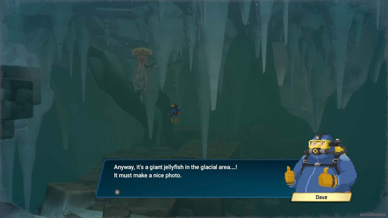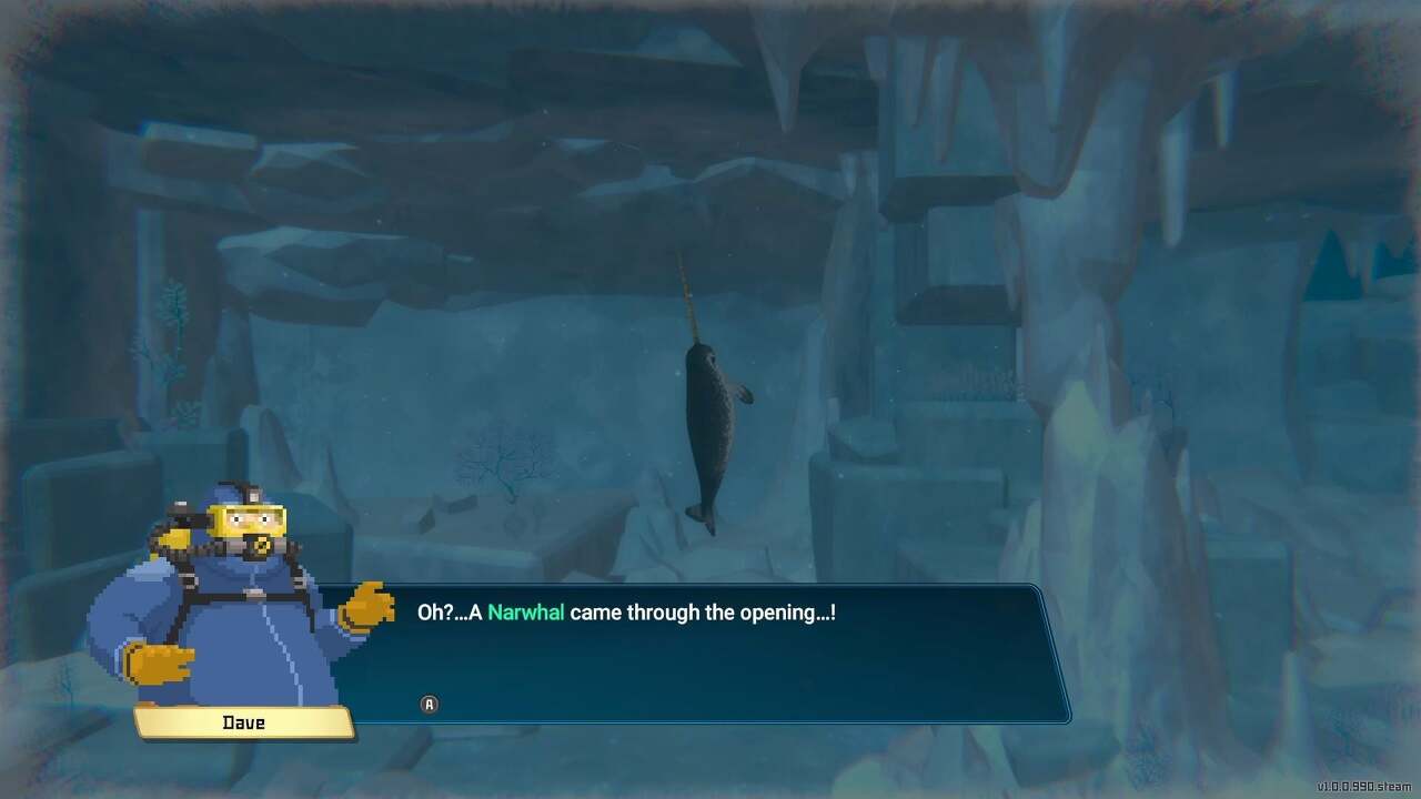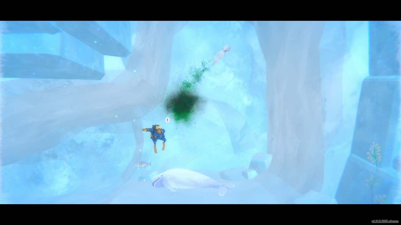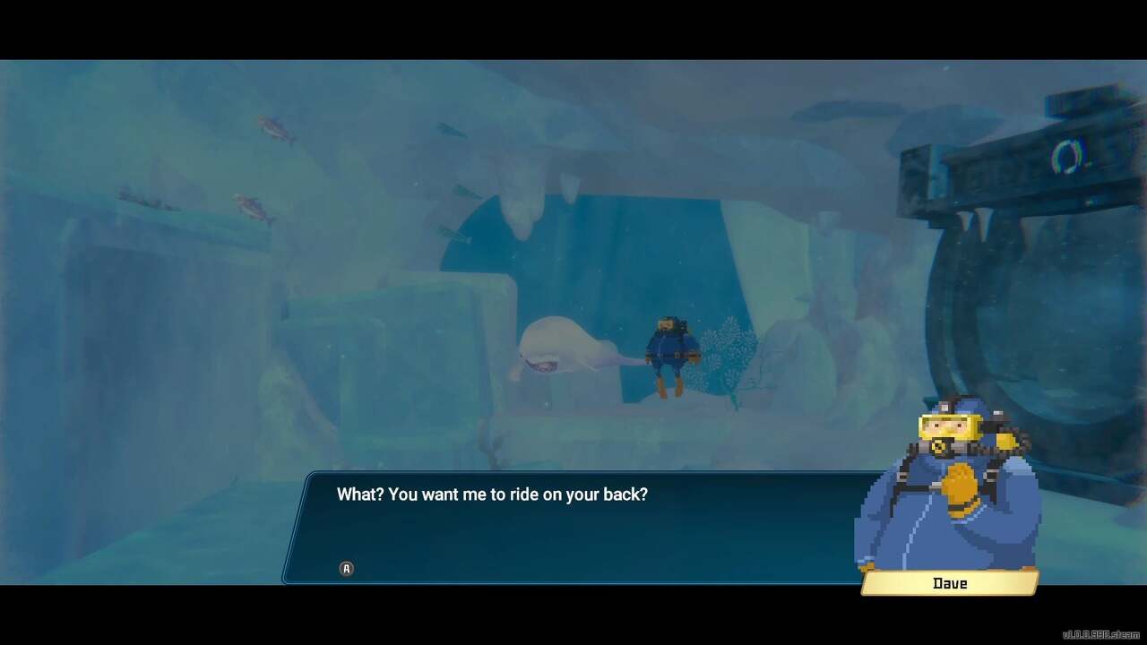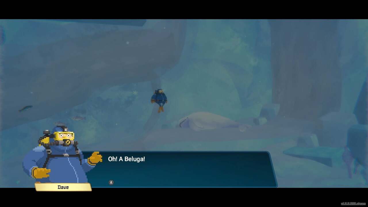 조류는 전날만큼 강하지는 않지만 데이브가 통과하기에는 여전히 너무 강합니다. 아까 구출한 벨루가가 나타나서 등에 태워주겠다고 제안합니다. 데이브가 올라타면 당신은 동굴로 들어갈 것입니다.