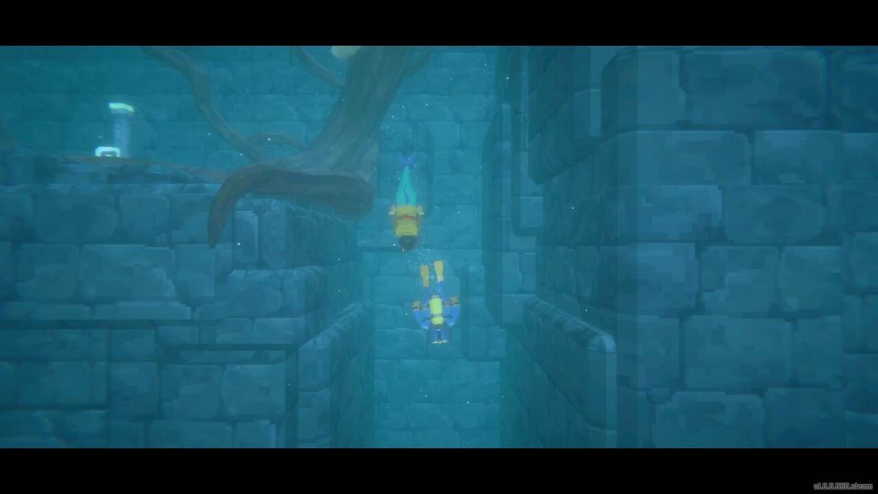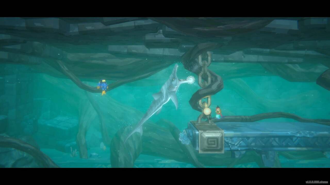 두 캐릭터가 오른쪽에 있는 또 다른 돌판과 왼쪽에 있는 사슬을 만날 때까지 수영하게 하세요. 한 캐릭터가 체인을 아래로 당기고 석판을 올리도록 합니다. 그런 다음 다른 캐릭터를 반대편으로 헤엄쳐 그곳에서 찾은 사슬을 당겨서 첫 번째 캐릭터가 돌판 아래에서 수영하여 합류할 수 있도록 합니다.