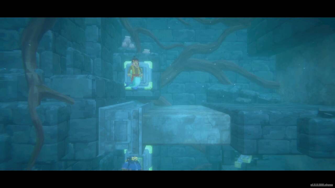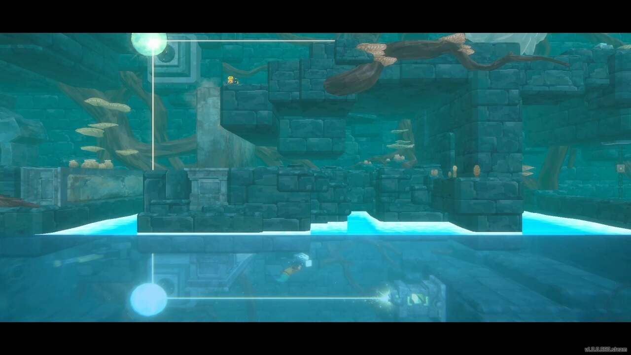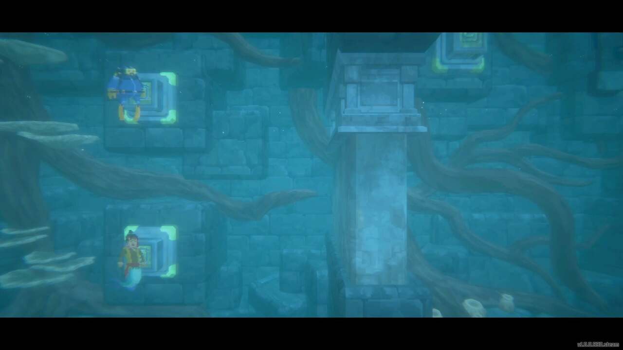 여기에서 다음 방으로 헤엄쳐 내려가 양쪽에 사슬이 달린 커다란 돌 블록을 집으세요. 석판을 들어 올리려면 두 문자를 모두 사용해야 합니다. 일단 그것을 얻었으면 그것을 왼쪽이나 오른쪽에 놓고 방금 열었던 영역으로 계속 내려가십시오.