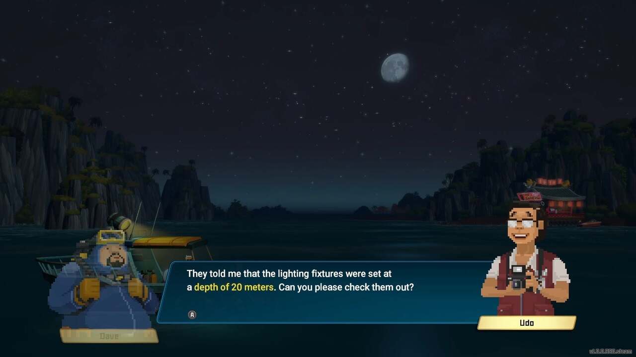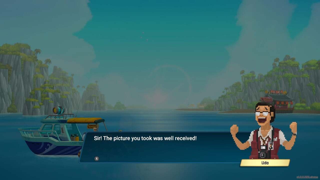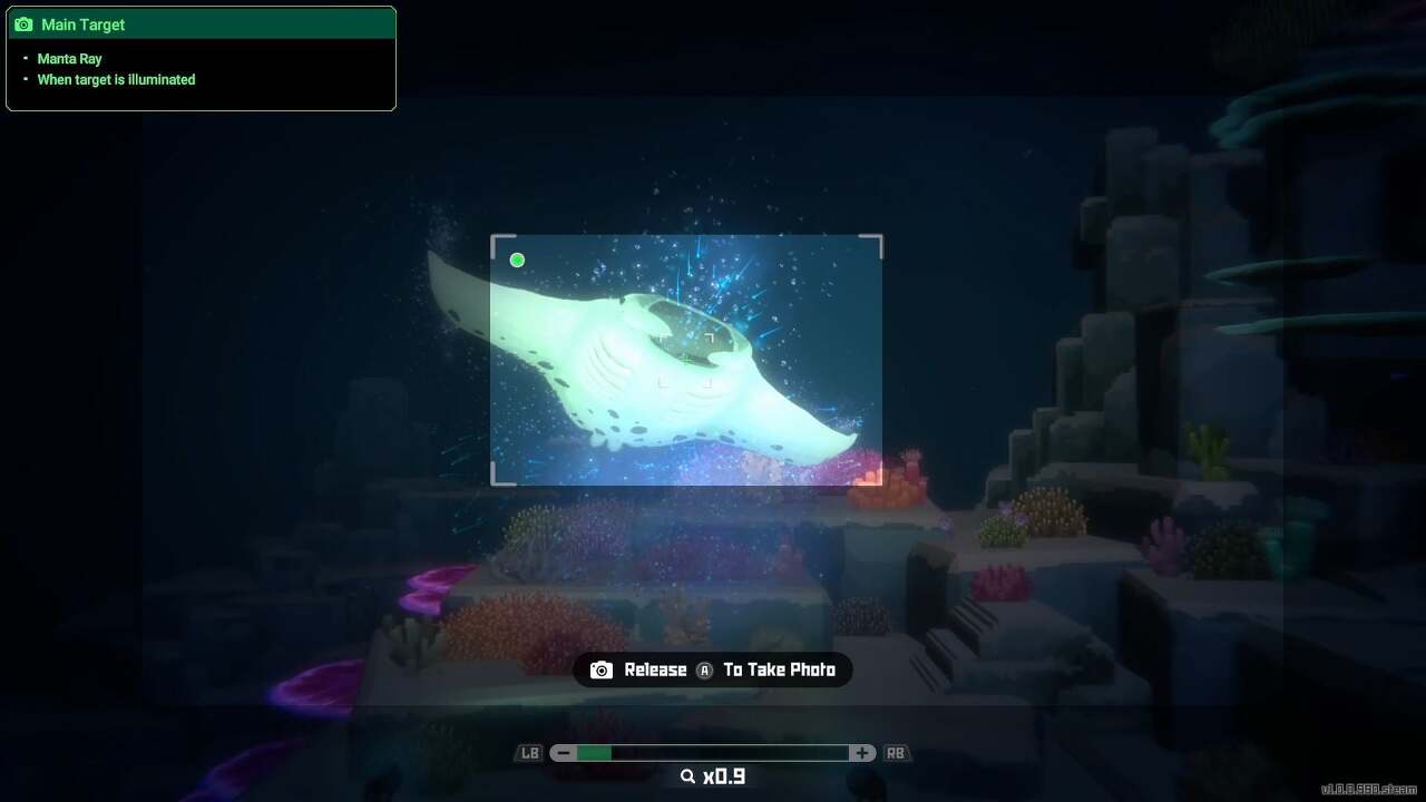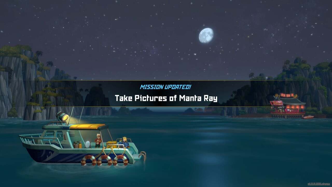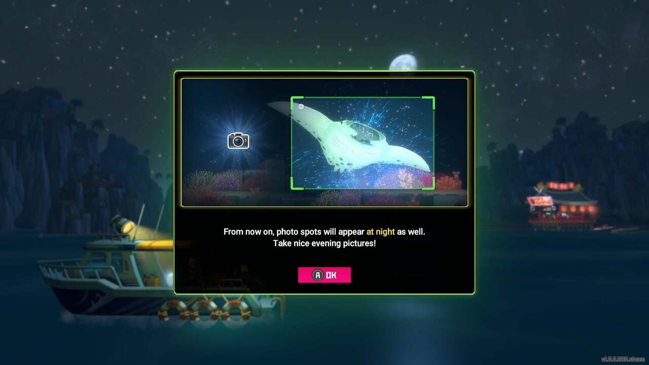 최고의 사진을 찍으려면 카메라를 0.9로 확대하고 프레임이 조명에 비치도록 위치를 지정하세요. 만타 가오리가 플랑크톤을 먹기 위해 중앙으로 올 때까지 기다렸다가 조명이 켜지면 사진을 찍으세요. 표면으로 돌아가 매우 행복한 우도와 대화하면 보상으로 1,000골드를 줍니다 . 이제 밤에도 사진을 찍을 수 있게 됩니다!