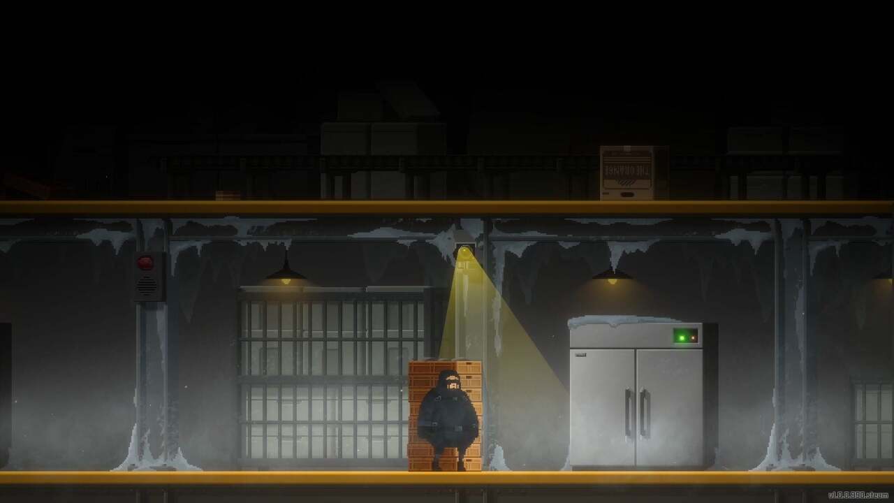 해야 할 일은 다음과 같습니다. 왼쪽에 있는 경비원이 당신이 있는 냉동고를 지나가자마자 오른쪽으로 가세요. 오른쪽에 있는 경비원이 상자 근처에 서 있으면 그가 떠날 때까지 기다린 다음 카메라가 당신을 보지 않을 때 상자 더미 뒤에 숨으십시오.