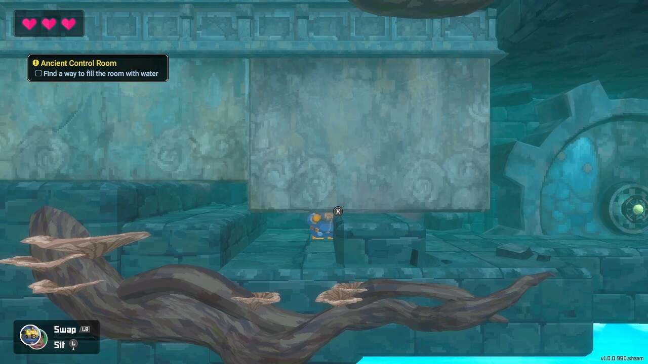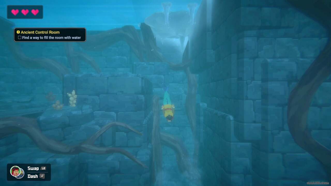 다음 방에서는 방 중앙에 있는 큰 레버로 헤엄쳐 가세요. 이렇게 하면 신성한 나무 제어실을 열 수 있는 세 번째이자 마지막 스위치가 활성화되고 방 오른쪽 하단에 있는 돌문이 열립니다. 또 다른 보스전을 벌일 준비가 되면 저 문으로 들어가세요.