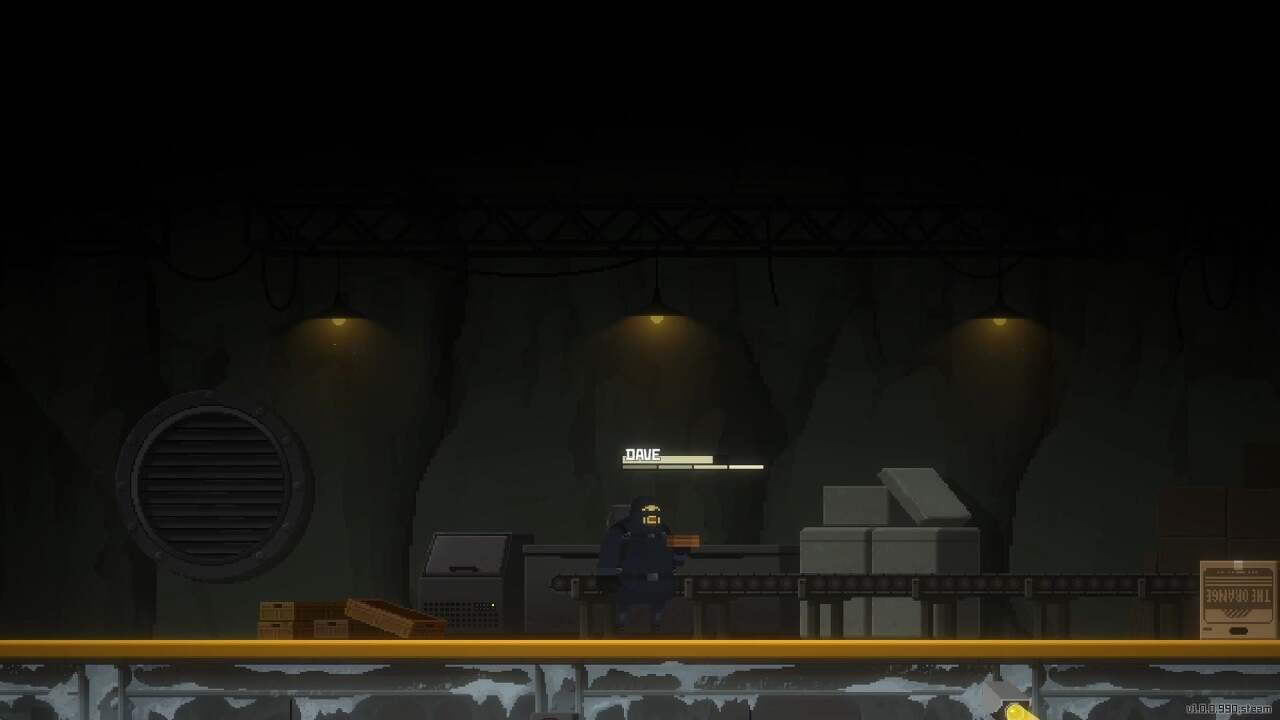 데이브가 판지 상자에 올 때까지 앞으로 이동하는 것부터 시작하세요. 상자 뒤에 몸을 웅크리고 바닥을 순찰하던 경비원이 상자 앞으로 다가올 때까지 기다리세요. 경비원은 잠시 여기에 머물 것입니다. 그가 순찰을 다시 시작하면 스페이스바나 X/사각형을 사용하여 상자 위로 점프하고 그가 사다리를 지나 멈출 때까지 그를 따라가세요. 그가 보지 않는 동안 사다리를 타고 올라가세요.