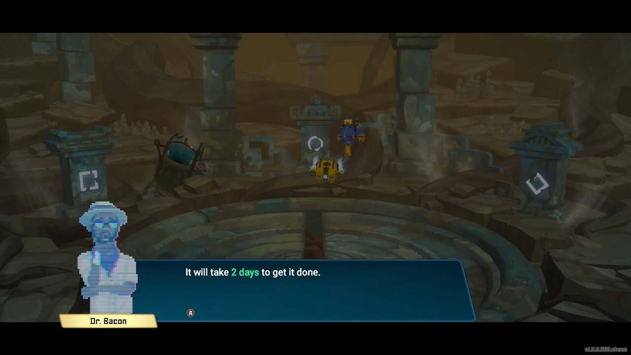 몇 번의 시도가 필요하기는 하지만 결국에는 크로노사우루스를 물리칠 수 있습니다. 그 후, 더프와 베이컨 박사가 제작한 드론이 당신에게 연락할 것입니다. 드론은 신수 통제실 입구를 막고 있는 뿌리를 잘라낼 수 있지만, 그러기 위해서는 2일이 소요된다. 베이컨 박사가 끝나면 알려줄 겁니다.