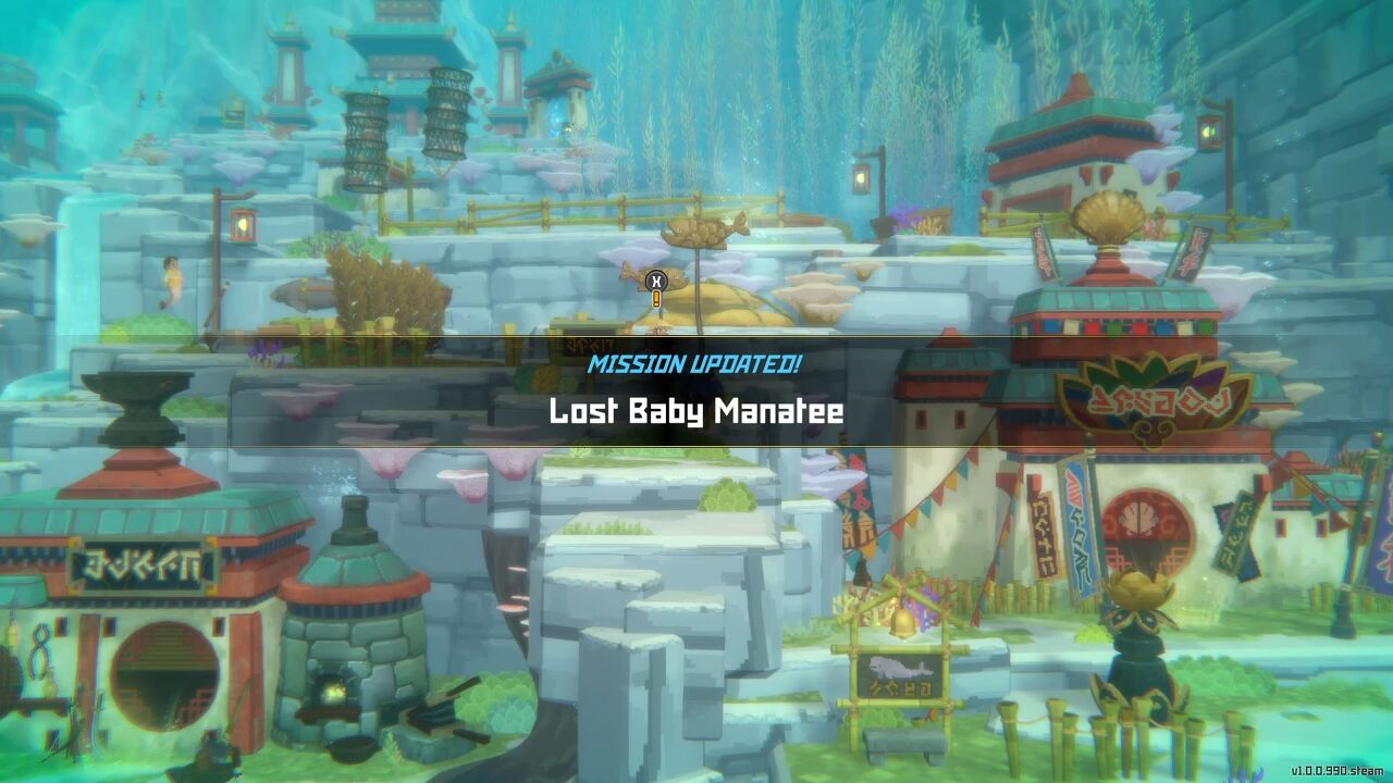 이전과 마찬가지로 진행하려면 상어를 제거해야 합니다. 매너티로부터 멀리 떨어져서 매너티의 위나 아래로 이동하여 돌격 공격을 피한 후 쏘세요. 상어가 쓰러지면 몸을 조사하여 약탈한 다음 해당 지역을 나가세요. 아기 매너티는 스스로 돌아갈 길을 찾을 수 있으므로 작업은 완료됩니다. 구모에게 돌아가서 베이 35개 , 바다포도 씨앗 3개 , 한천 씨앗 3개를 받고 퀘스트를 완료하세요.