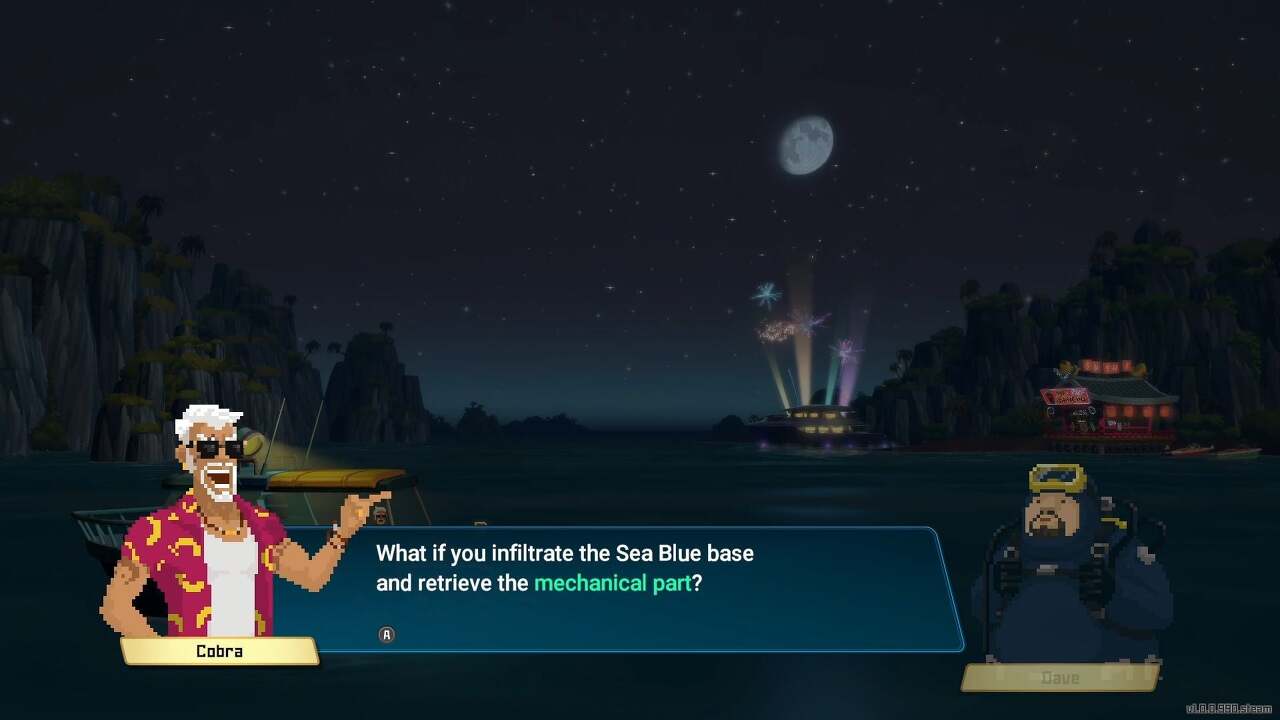 저녁이 되면 Cobra는 자신의 계획을 알려줄 것입니다. Sea Blue 드론 중 하나를 따라 은신처로 가서 필요한 부품을 훔치는 것입니다. 아직 충분히 어둡지 않으니 반초스시로 가서 일을 처리하세요.